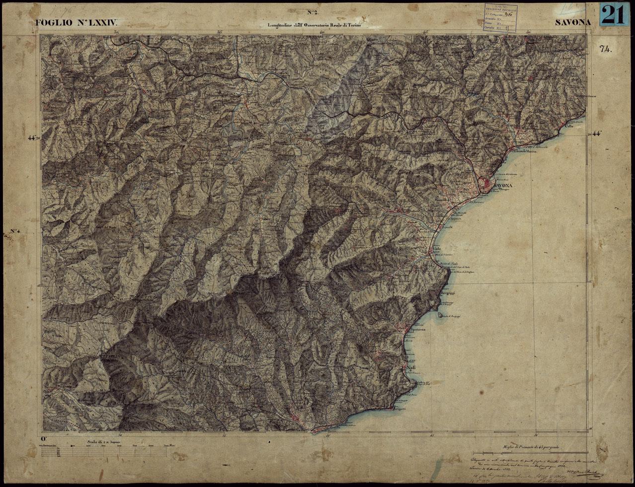 CARTA TOPOGRAFICA DEGLI STATI IN TERRAFERMA DI S.M. IL RE DI SARDEGNA ALLA SCALA DI 1 A 50.000 OPERA DEL CORPO REALE DELLO STATO MAGGIORE - FOGLIO N°LXXIV SAVONA
