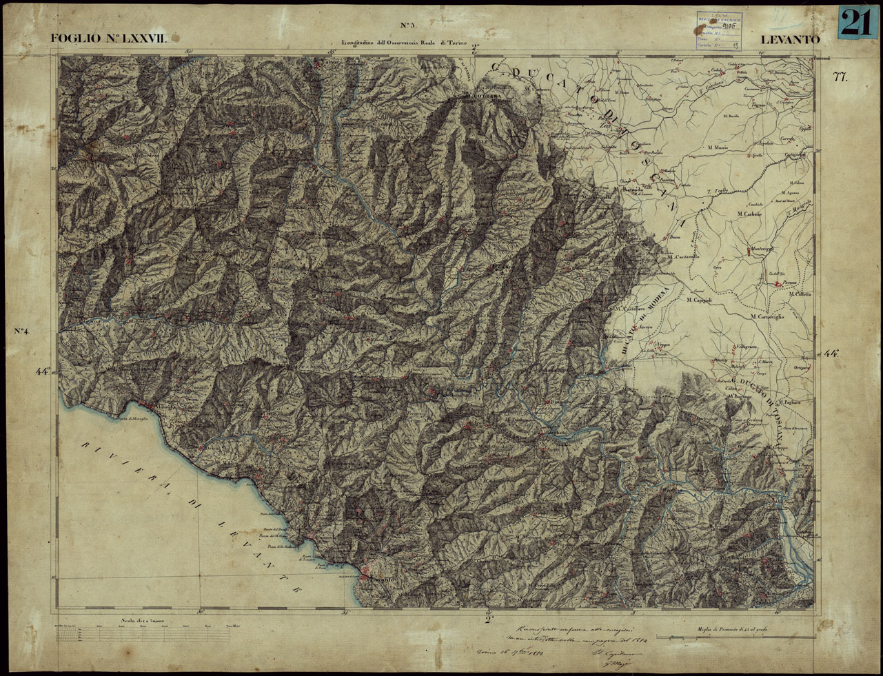 CARTA TOPOGRAFICA DEGLI STATI IN TERRAFERMA DI S.M. IL RE DI SARDEGNA ALLA SCALA DI 1 A 50.000 OPERA DEL CORPO REALE DELLO STATO MAGGIORE - FOGLIO N°LXXVII LEVANTO