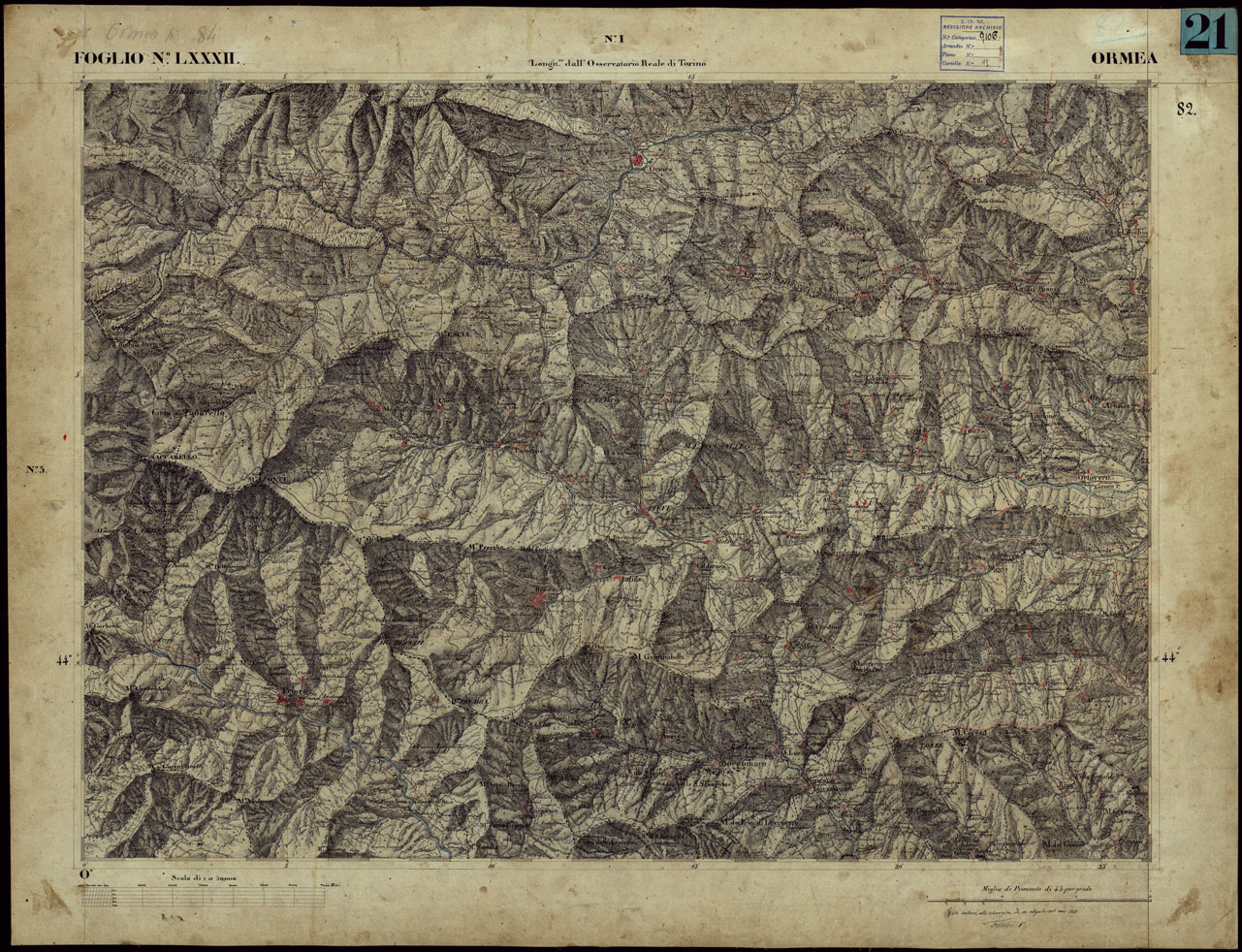 CARTA TOPOGRAFICA DEGLI STATI IN TERRAFERMA DI S.M. IL RE DI SARDEGNA ALLA SCALA DI 1 A 50.000 OPERA DEL CORPO REALE DELLO STATO MAGGIORE - FOGLIO N°LXXXII ORMEA