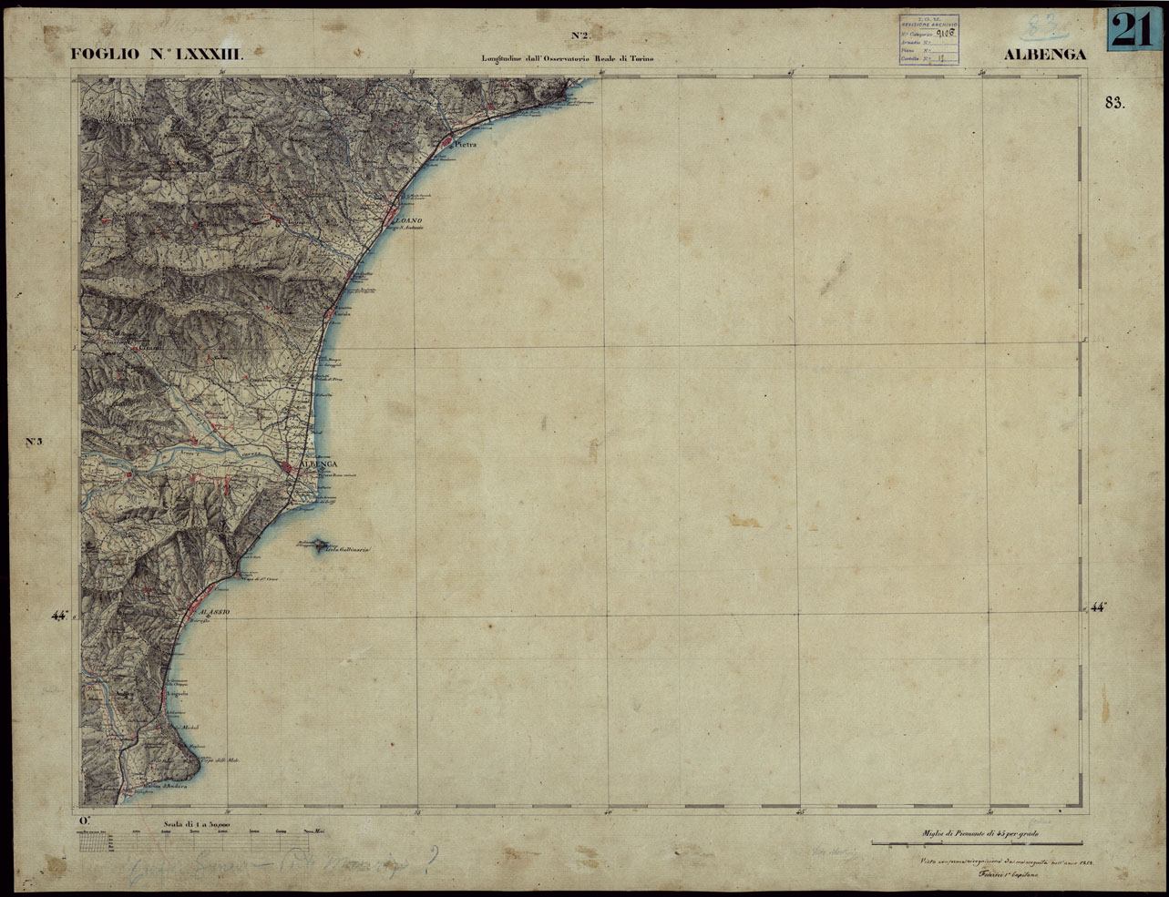 CARTA TOPOGRAFICA DEGLI STATI IN TERRAFERMA DI S.M. IL RE DI SARDEGNA ALLA SCALA DI 1 A 50.000 OPERA DEL CORPO REALE DELLO STATO MAGGIORE - FOGLIO N°LXXXIII ALBENGA