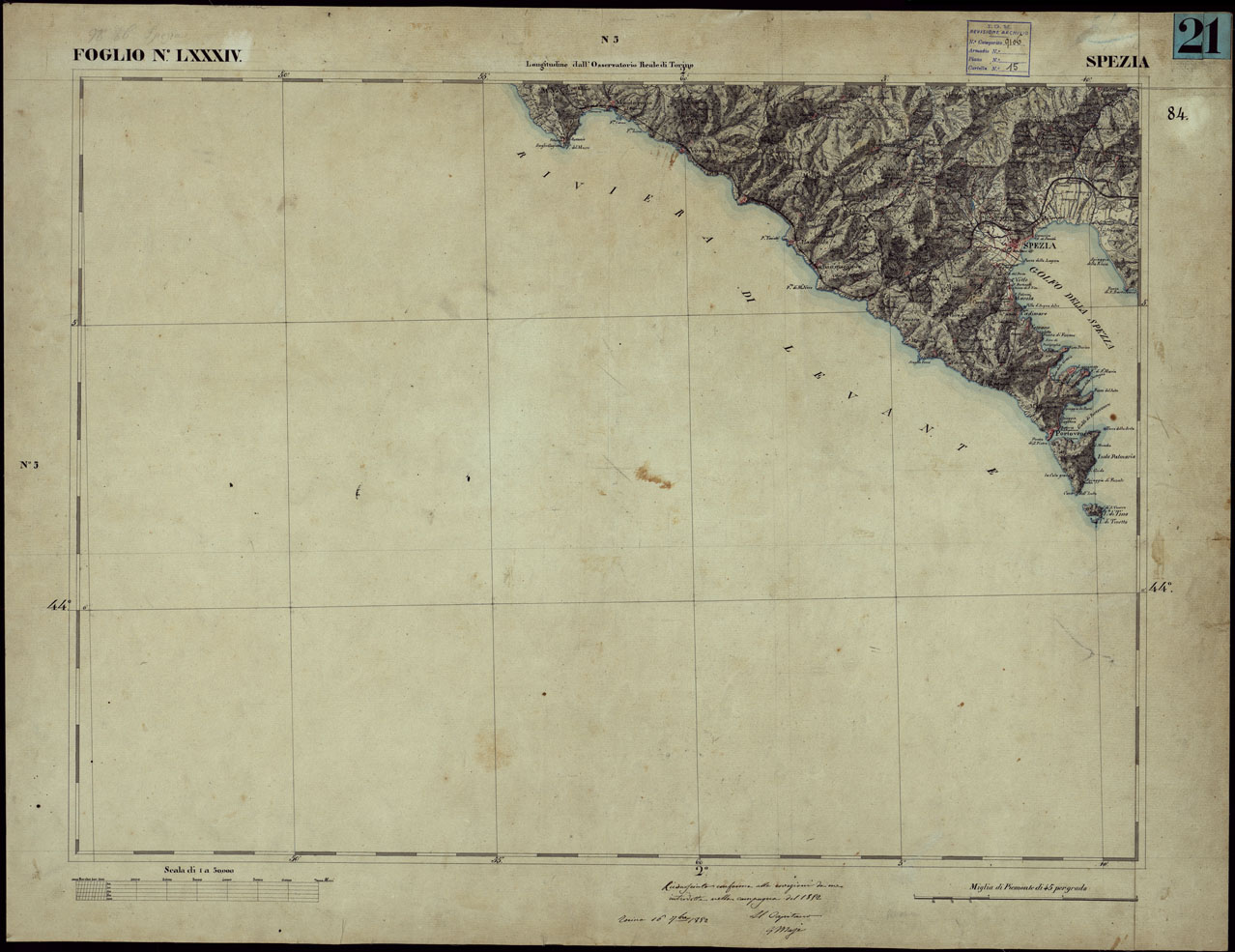 CARTA TOPOGRAFICA DEGLI STATI IN TERRAFERMA DI S.M. IL RE DI SARDEGNA ALLA SCALA DI 1 A 50.000 OPERA DEL CORPO REALE DELLO STATO MAGGIORE - FOGLIO N°LXXXIV SPEZIA