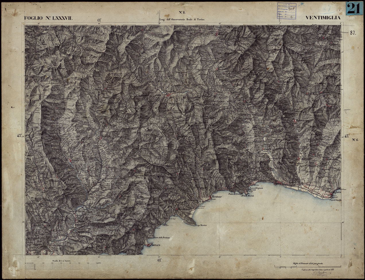 CARTA TOPOGRAFICA DEGLI STATI IN TERRAFERMA DI S.M. IL RE DI SARDEGNA ALLA SCALA DI 1 A 50.000 OPERA DEL CORPO REALE DELLO STATO MAGGIORE - FOGLIO N°LXXXVII VENTIMIGLIA