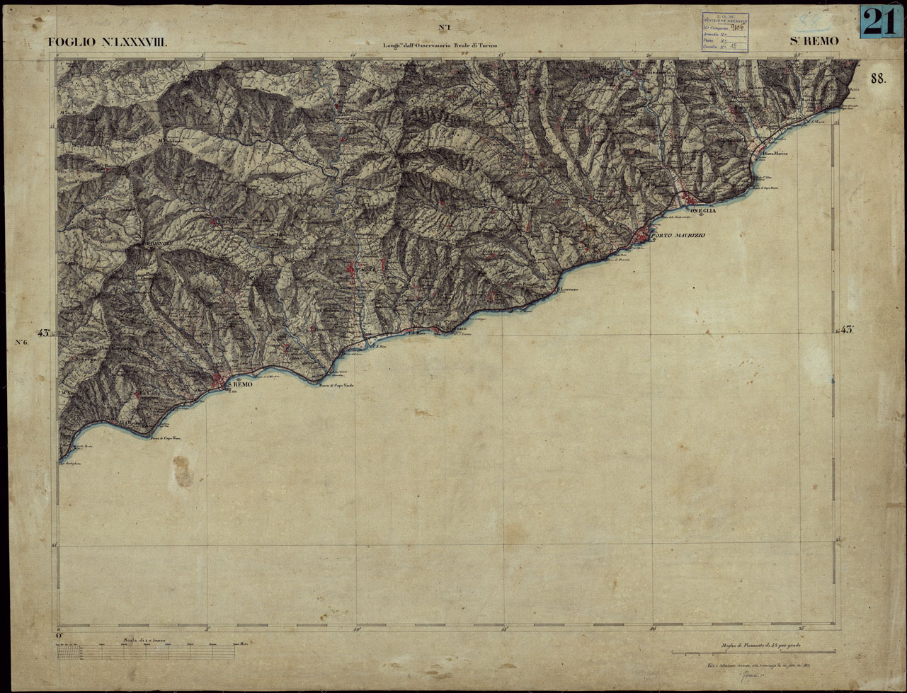 CARTA TOPOGRAFICA DEGLI STATI IN TERRAFERMA DI S.M. IL RE DI SARDEGNA ALLA SCALA DI 1 A 50.000 OPERA DEL CORPO REALE DELLO STATO MAGGIORE - FOGLIO N°LXXXVIII S. REMO