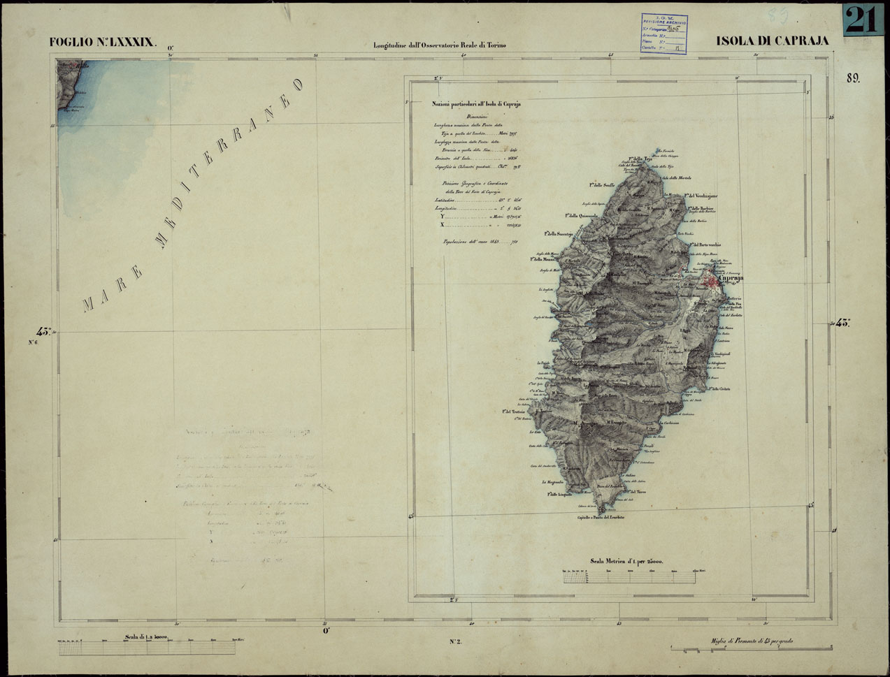 CARTA TOPOGRAFICA DEGLI STATI IN TERRAFERMA DI S.M. IL RE DI SARDEGNA ALLA SCALA DI 1 A 50.000 OPERA DEL CORPO REALE DELLO STATO MAGGIORE - FOGLIO N°LXXXIX ISOLA DI CAPRAIA
