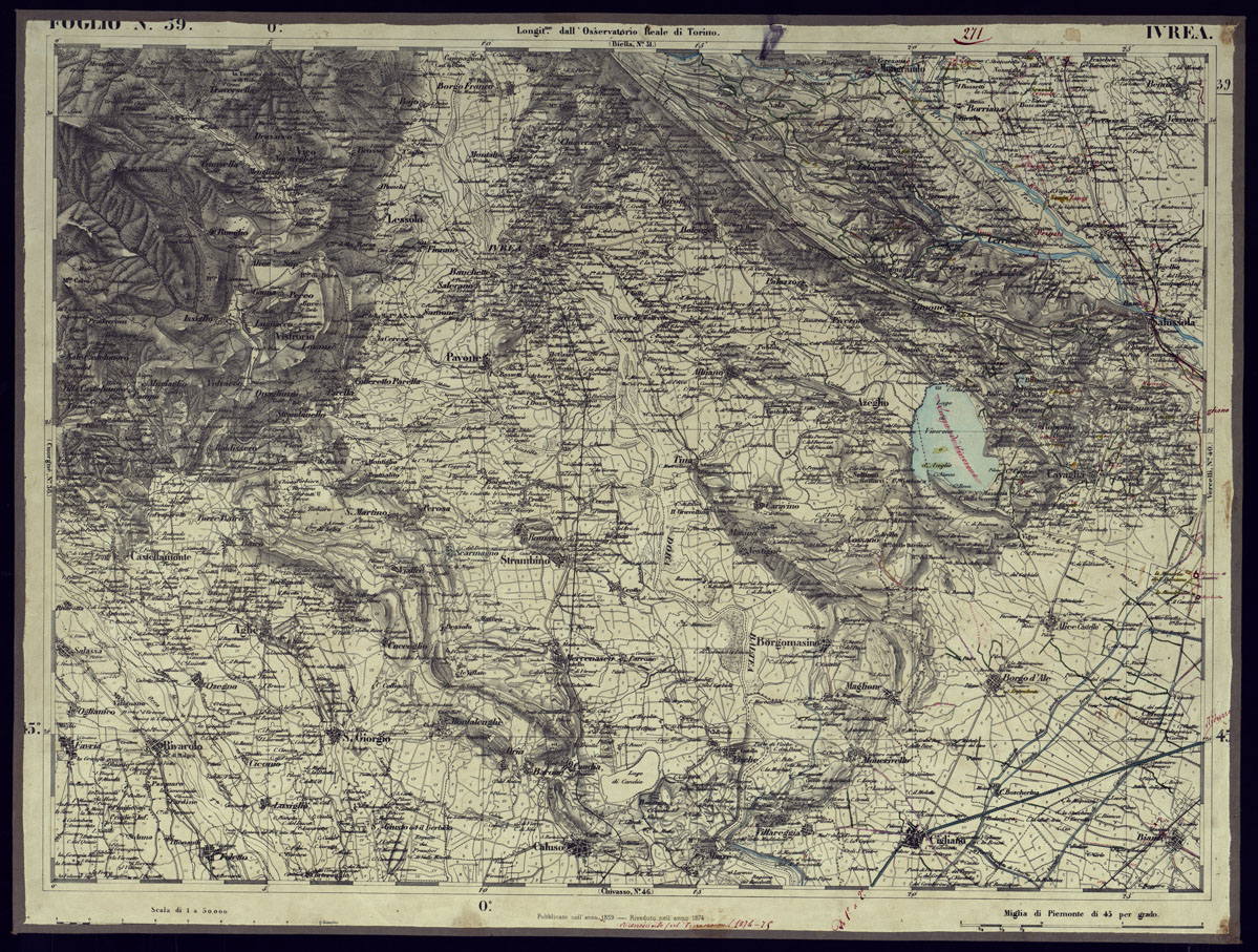 CARTA TOPOGRAFICA DEGLI STATI IN TERRAFERMA DI S.M. IL RE DI SARDEGNA ALLA SCALA DI 1 A 50.000 OPERA DEL CORPO REALE DELLO STATO MAGGIORE - FOGLIO N°39 IVREA