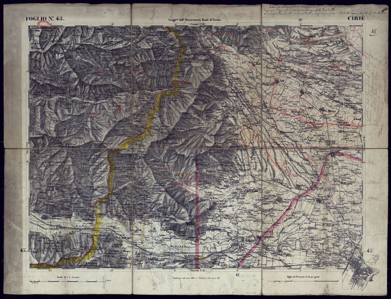 CARTA TOPOGRAFICA DEGLI STATI IN TERRAFERMA DI S.M. IL RE DI SARDEGNA ALLA SCALA DI 1 A 50.000 OPERA DEL CORPO REALE DELLO STATO MAGGIORE - FOGLIO N°45 CIRIE'