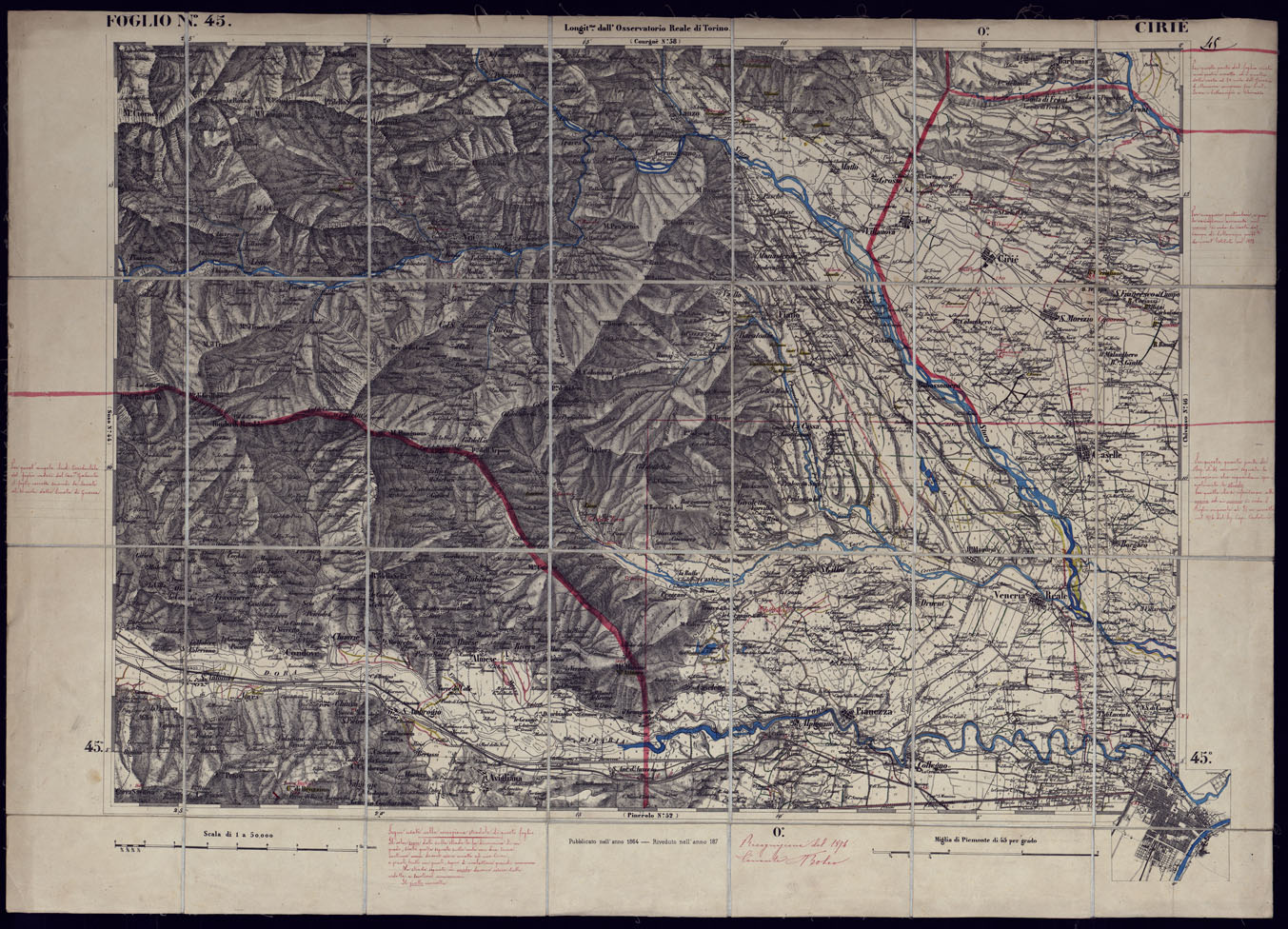 CARTA TOPOGRAFICA DEGLI STATI IN TERRAFERMA DI S.M. IL RE DI SARDEGNA ALLA SCALA DI 1 A 50.000 OPERA DEL CORPO REALE DELLO STATO MAGGIORE - FOGLIO N°45 CIRIE'