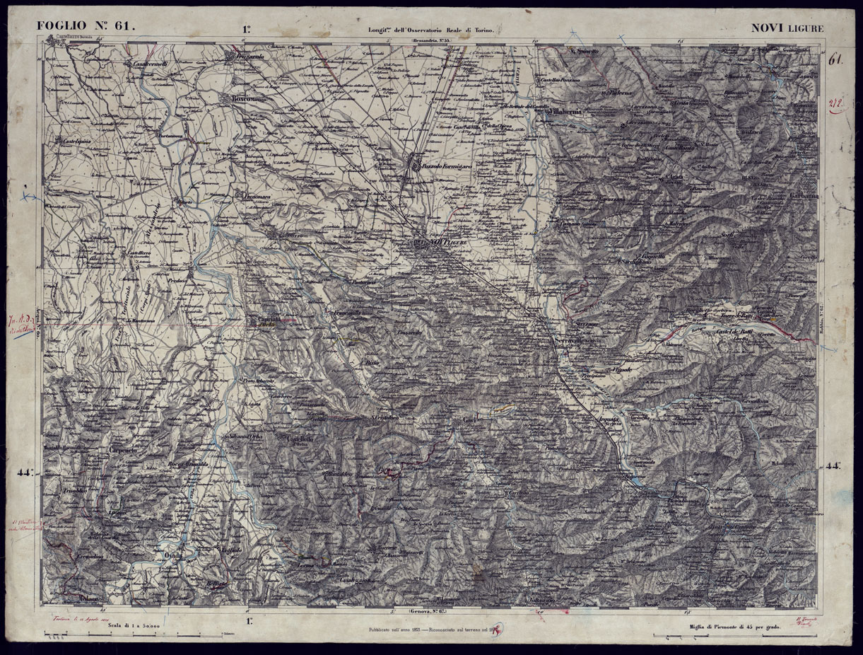 CARTA TOPOGRAFICA DEGLI STATI IN TERRAFERMA DI S.M. IL RE DI SARDEGNA ALLA SCALA DI 1 A 50.000 OPERA DEL CORPO REALE DELLO STATO MAGGIORE - FOGLIO N°61 NOVI LIGURE
