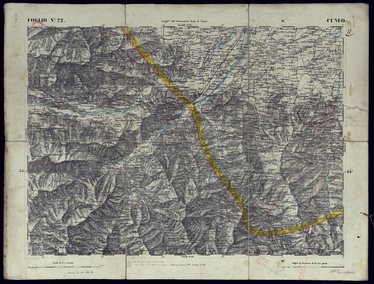 CARTA TOPOGRAFICA DEGLI STATI IN TERRAFERMA DI S.M. IL RE DI SARDEGNA ALLA SCALA DI 1 A 50.000 OPERA DEL CORPO REALE DELLO STATO MAGGIORE - FOGLIO N°72 CUNEO