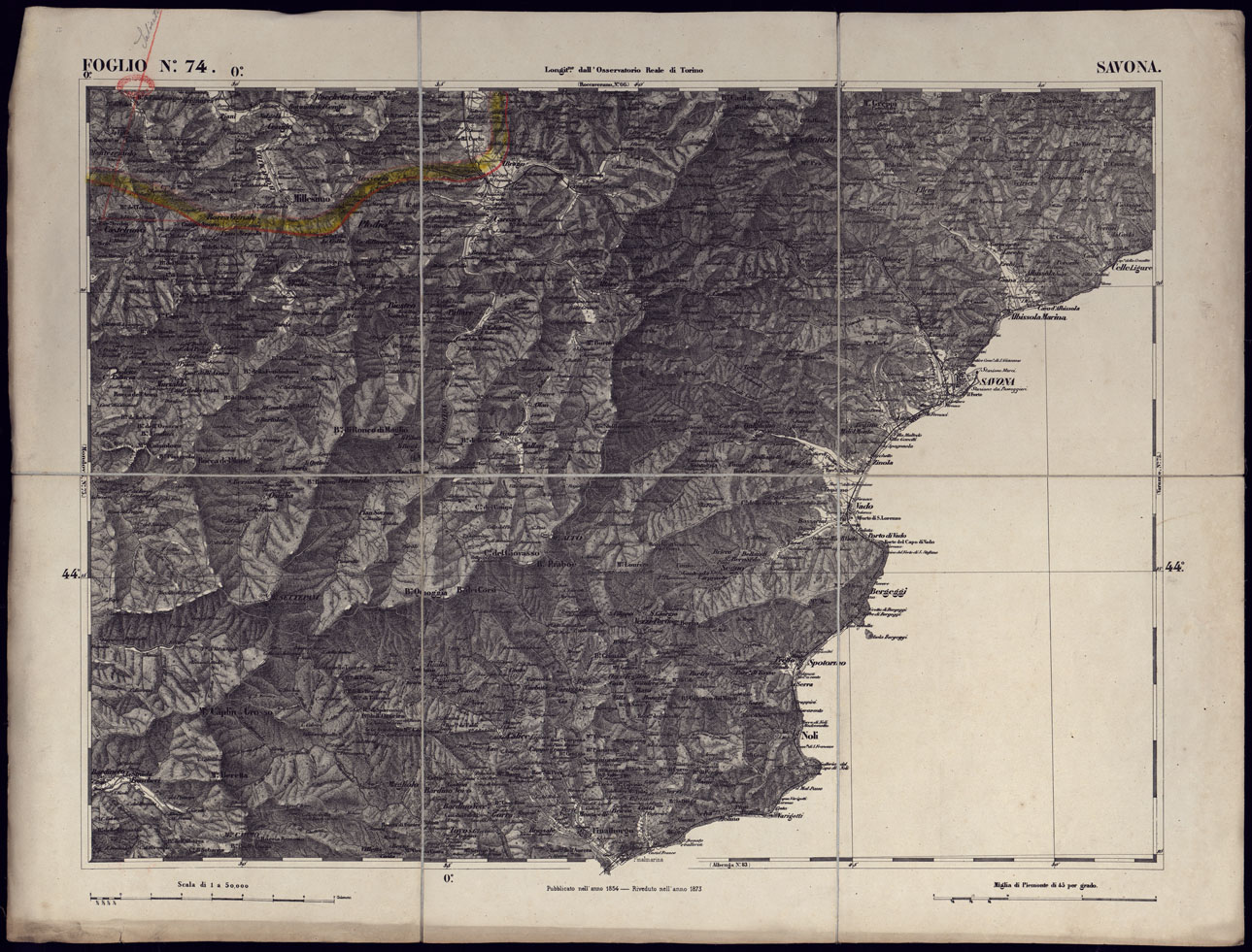 CARTA TOPOGRAFICA DEGLI STATI IN TERRAFERMA DI S.M. IL RE DI SARDEGNA ALLA SCALA DI 1 A 50.000 OPERA DEL CORPO REALE DELLO STATO MAGGIORE - FOGLIO N°74 SAVONA