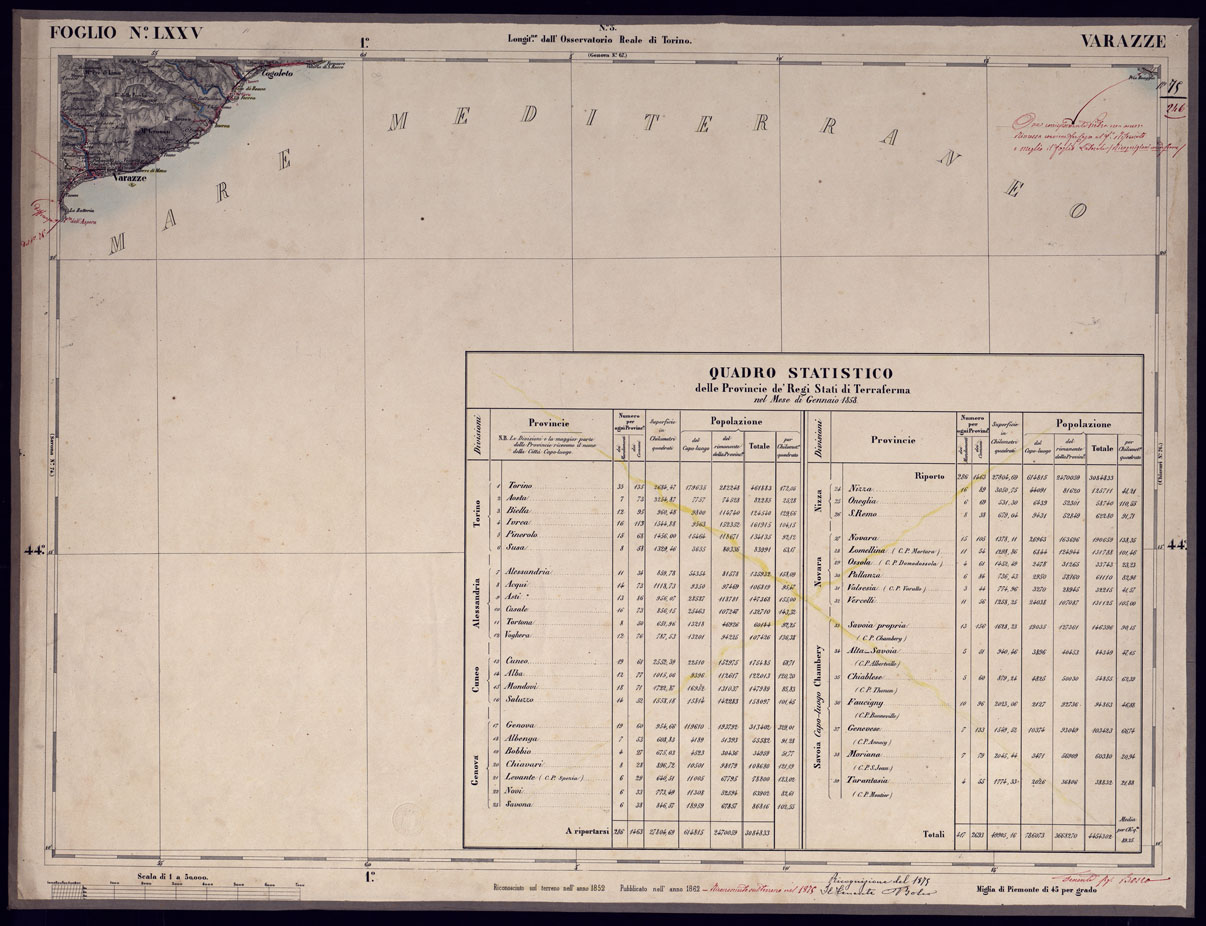 CARTA TOPOGRAFICA DEGLI STATI IN TERRAFERMA DI S.M. IL RE DI SARDEGNA ALLA SCALA DI 1 A 50.000 OPERA DEL CORPO REALE DELLO STATO MAGGIORE - FOGLIO N°LXXV VARAZZE