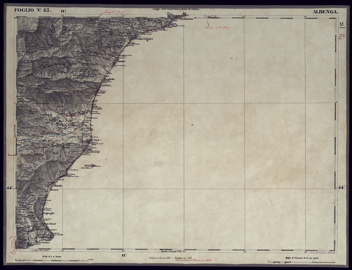 CARTA TOPOGRAFICA DEGLI STATI IN TERRAFERMA DI S.M. IL RE DI SARDEGNA ALLA SCALA DI 1 A 50.000 OPERA DEL CORPO REALE DELLO STATO MAGGIORE - FOGLIO N°83 ALBENGA
