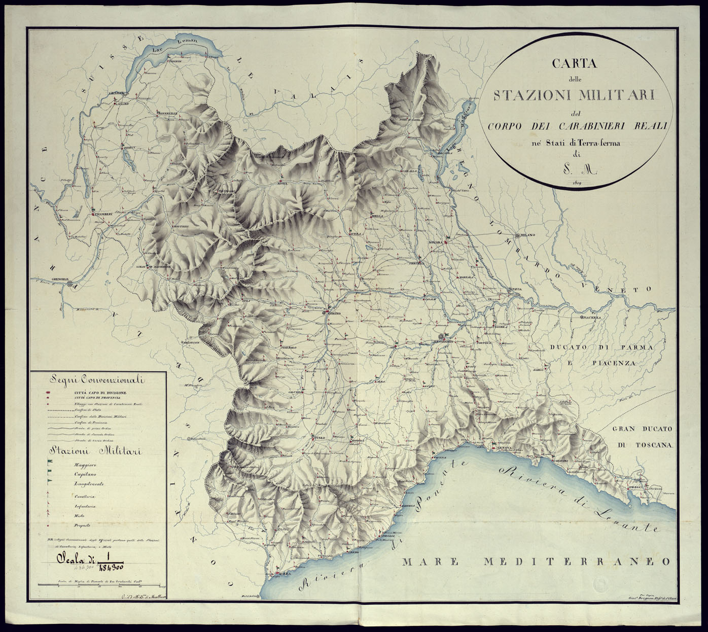 "Disegno a penna a più colori, accuratamente eseguito e acquerellato per la rappresentazione dell'orografia. Scala grafica di 30 miglia di Piemonte di 800 trabucchi. Il disegno porta in calce l'indicazione: "Per copia Gius.e Brignon Dis.e di 1° classe" e il visto del Barone di Monthoux. Una tabella di segni convenzionali indica che sono distinte le città capo di divisione e di provincia e i villaggi con stazioni di Carabinieri Reali, i confini di Stato, di divisione e di provincia, le strade di 1°, 2° e 3° ordine e le sedi delle stazioni militari per le diverse armi. Sono annesse due tabelle indicanti lo stato generale di tutte le stazioni dei Carabinieri al 6 settembre 1818. Documento interessante per la storia militare del Piemonte e particolarmente per quella dell'Arma dei Carabinieri."