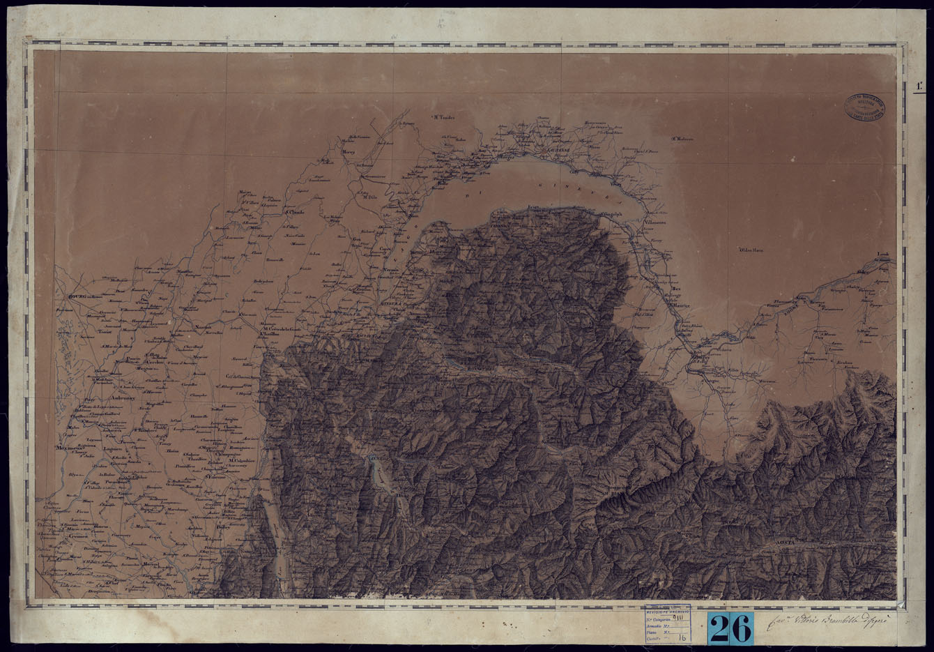 "Disegno originale a penna a più colori, in 6 fogli + un supplemento al foglio 6 finemente eseguito e artisticamente tratteggiato per la rappresentazione orografica, che servì di modello per l'incisione su rame della corrispondente carta pubblicata nel 1841. Il disegno è opera dell'Ingegnere Topografo V. Brambilla, che alla pubblicazione di questa carta deve appunto la sua grande e meritata notorietà. "