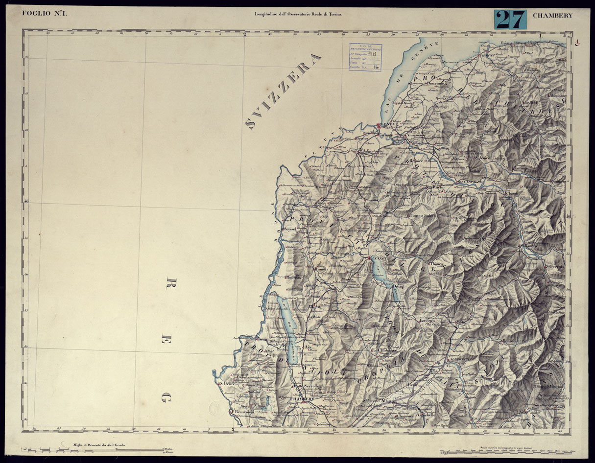 CARTA delle STRADE NEGLI STATI DI SUA MAESTA' IN TERRAFERMA PER USO DELL'ECCELL.MO CONSIGLIO SUPERIORE D'ACQUE E STRADE RIDOTTA DALLA GRAN CARTA TOPOGRAFICA DI RECENTE FORMATA DAL REAL CORPO DI STATO MAGGIORE GENERALE - FOGLIO N.I - CHAMBERY.