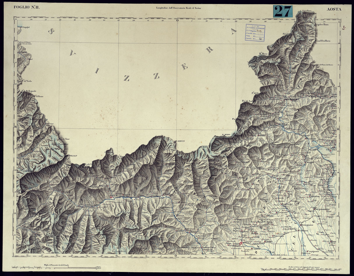CARTA delle STRADE NEGLI STATI DI SUA MAESTA' IN TERRAFERMA PER USO DELL'ECCELL.MO CONSIGLIO SUPERIORE D'ACQUE E STRADE RIDOTTA DALLA GRAN CARTA TOPOGRAFICA DI RECENTE FORMATA DAL REAL CORPO DI STATO MAGGIORE GENERALE - FOGLIO N.II - AOSTA.
