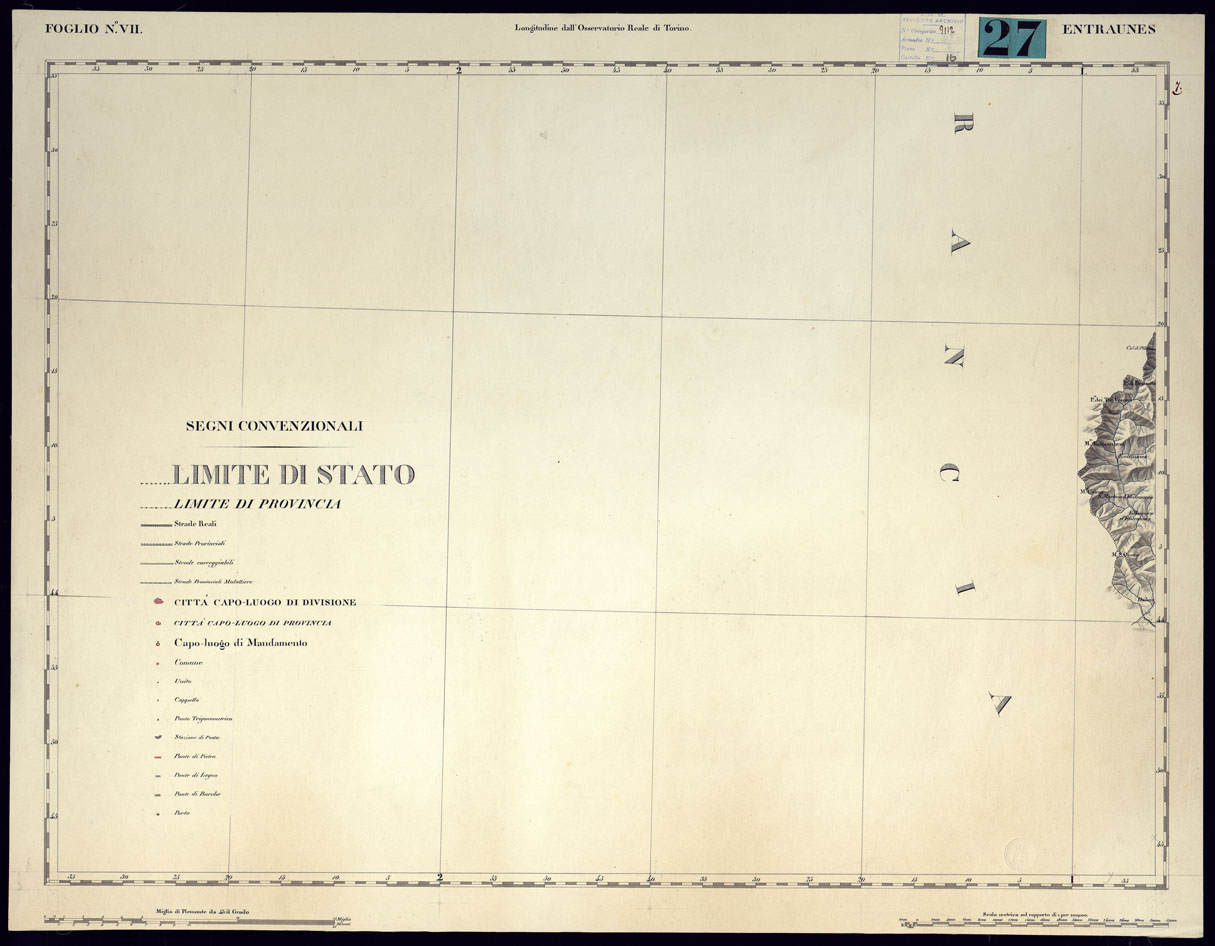 CARTA delle STRADE NEGLI STATI DI SUA MAESTA' IN TERRAFERMA PER USO DELL'ECCELL.MO CONSIGLIO SUPERIORE D'ACQUE E STRADE RIDOTTA DALLA GRAN CARTA TOPOGRAFICA DI RECENTE FORMATA DAL REAL CORPO DI STATO MAGGIORE GENERALE - FOGLIO N.VII - ENTRAUNES.