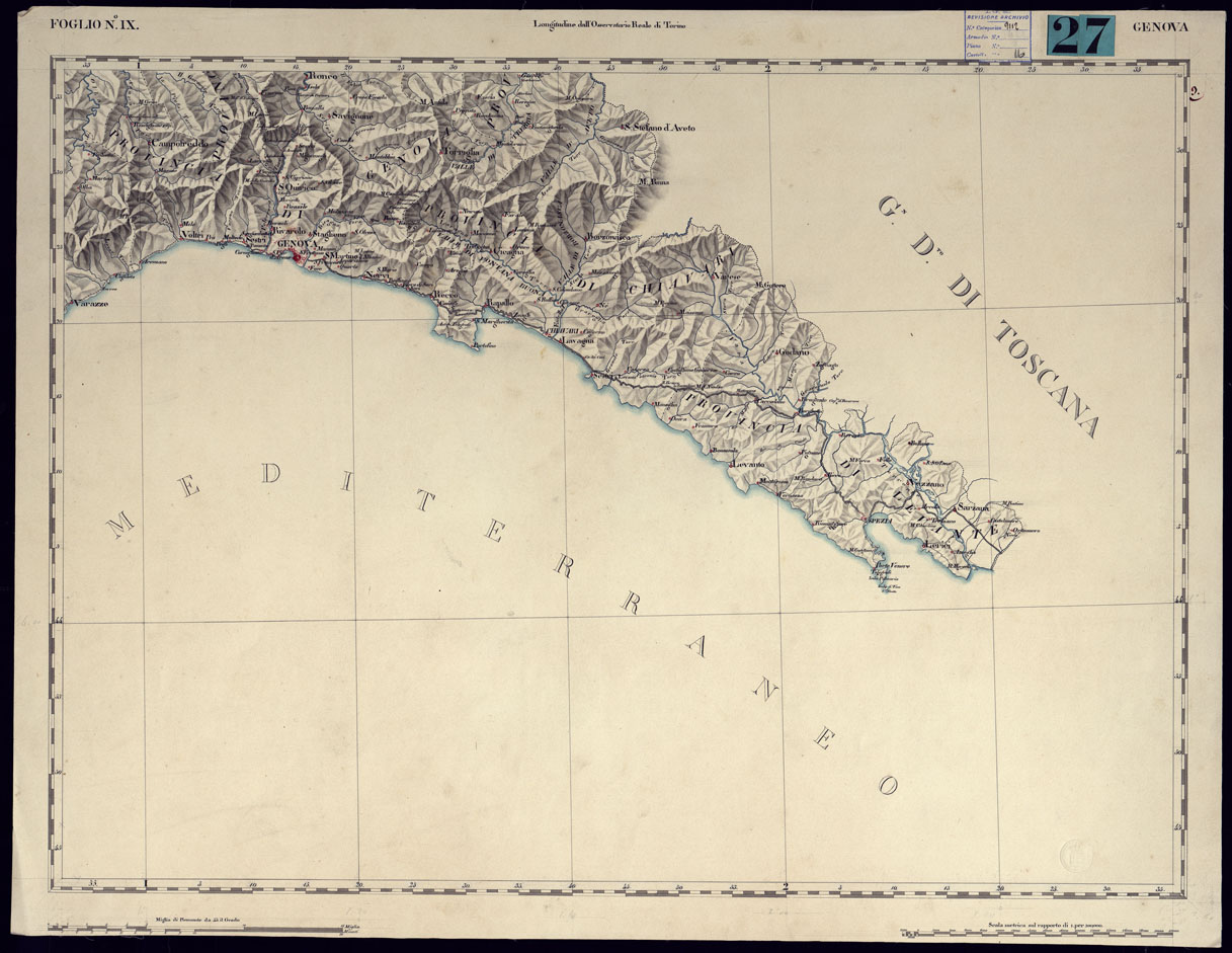 CARTA delle STRADE NEGLI STATI DI SUA MAESTA' IN TERRAFERMA PER USO DELL'ECCELL.MO CONSIGLIO SUPERIORE D'ACQUE E STRADE RIDOTTA DALLA GRAN CARTA TOPOGRAFICA DI RECENTE FORMATA DAL REAL CORPO DI STATO MAGGIORE GENERALE - FOGLIO N.IX GENOVA.
