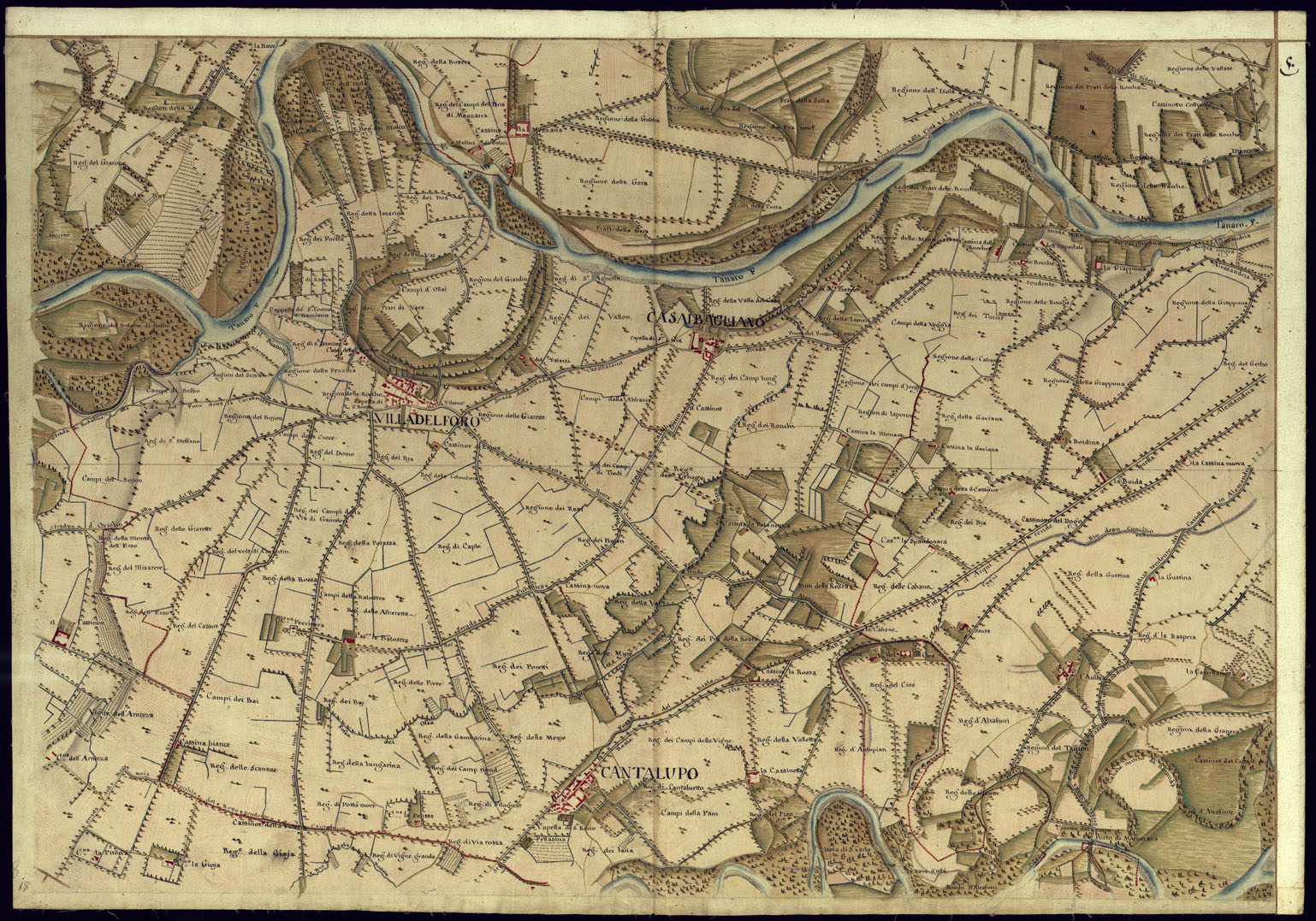 "Cinquantasei fogli più un quadro d'unione, disegnati a penna a più tinte ed acquerellati. Non portano indicazione di data nè di autore, ma si possono ritenere opera della fine del secolo XVIII. Documento topografico del più grande interesse per la copia grandissima degli elementi topografici che vi sono rappresentati, come comporta la notevole grandezza della scala del disegno e per la chiarezza e l'evidenza artistica della rappresentazione. Le città e i villaggi sono rappresentati nella loro pianta geometrica dettagliatissima. Ricchissima pure la toponomastica relativa ai centri abitati, corsi d'acqua, strade, regioni. Sono indicate con diverse tinte le differenti zone di cultura."