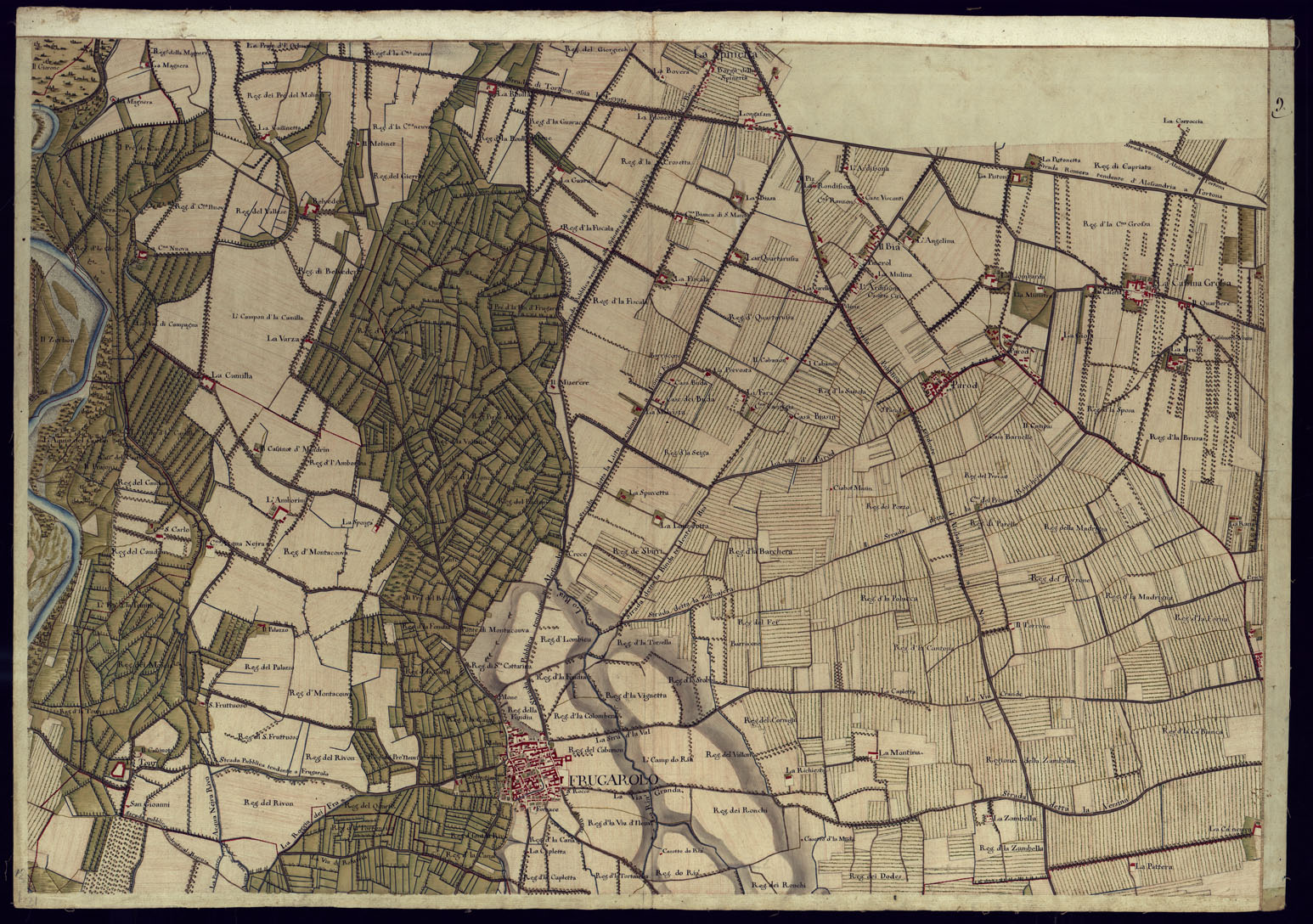 "Cinquantasei fogli più un quadro d'unione, disegnati a penna a più tinte ed acquerellati. Non portano indicazione di data nè di autore, ma si possono ritenere opera della fine del secolo XVIII. Documento topografico del più grande interesse per la copia grandissima degli elementi topografici che vi sono rappresentati, come comporta la notevole grandezza della scala del disegno e per la chiarezza e l'evidenza artistica della rappresentazione. Le città e i villaggi sono rappresentati nella loro pianta geometrica dettagliatissima. Ricchissima pure la toponomastica relativa ai centri abitati, corsi d'acqua, strade, regioni. Sono indicate con diverse tinte le differenti zone di cultura."