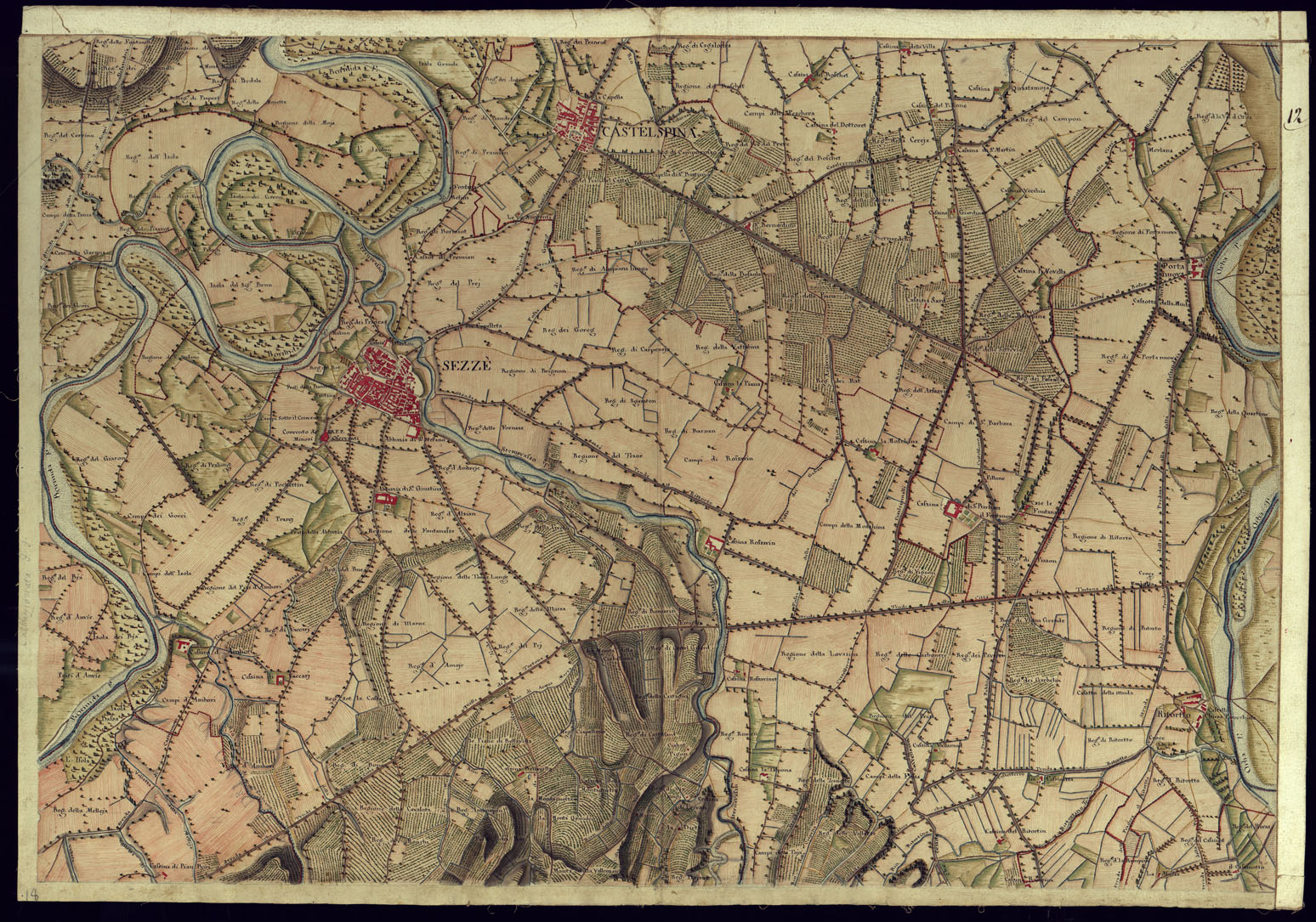 "Cinquantasei fogli più un quadro d'unione, disegnati a penna a più tinte ed acquerellati. Non portano indicazione di data nè di autore, ma si possono ritenere opera della fine del secolo XVIII. Documento topografico del più grande interesse per la copia grandissima degli elementi topografici che vi sono rappresentati, come comporta la notevole grandezza della scala del disegno e per la chiarezza e l'evidenza artistica della rappresentazione. Le città e i villaggi sono rappresentati nella loro pianta geometrica dettagliatissima. Ricchissima pure la toponomastica relativa ai centri abitati, corsi d'acqua, strade, regioni. Sono indicate con diverse tinte le differenti zone di cultura."