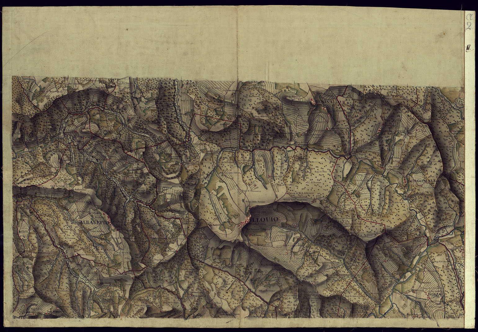 "Cinquantasei fogli più un quadro d'unione, disegnati a penna a più tinte ed acquerellati. Non portano indicazione di data nè di autore, ma si possono ritenere opera della fine del secolo XVIII. Documento topografico del più grande interesse per la copia grandissima degli elementi topografici che vi sono rappresentati, come comporta la notevole grandezza della scala del disegno e per la chiarezza e l'evidenza artistica della rappresentazione. Le città e i villaggi sono rappresentati nella loro pianta geometrica dettagliatissima. Ricchissima pure la toponomastica relativa ai centri abitati, corsi d'acqua, strade, regioni. Sono indicate con diverse tinte le differenti zone di cultura."