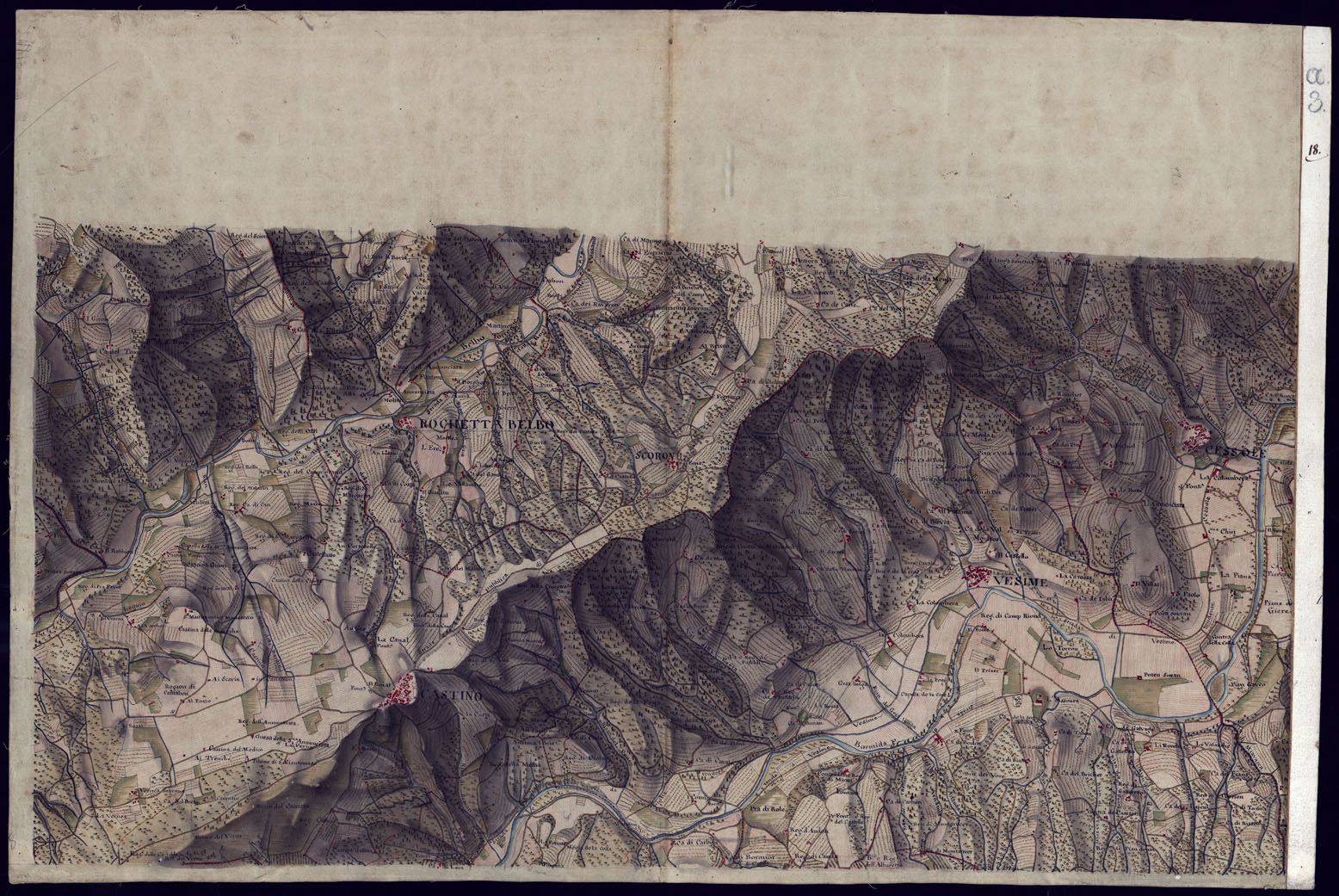 "Cinquantasei fogli più un quadro d'unione, disegnati a penna a più tinte ed acquerellati. Non portano indicazione di data nè di autore, ma si possono ritenere opera della fine del secolo XVIII. Documento topografico del più grande interesse per la copia grandissima degli elementi topografici che vi sono rappresentati, come comporta la notevole grandezza della scala del disegno e per la chiarezza e l'evidenza artistica della rappresentazione. Le città e i villaggi sono rappresentati nella loro pianta geometrica dettagliatissima. Ricchissima pure la toponomastica relativa ai centri abitati, corsi d'acqua, strade, regioni. Sono indicate con diverse tinte le differenti zone di cultura."