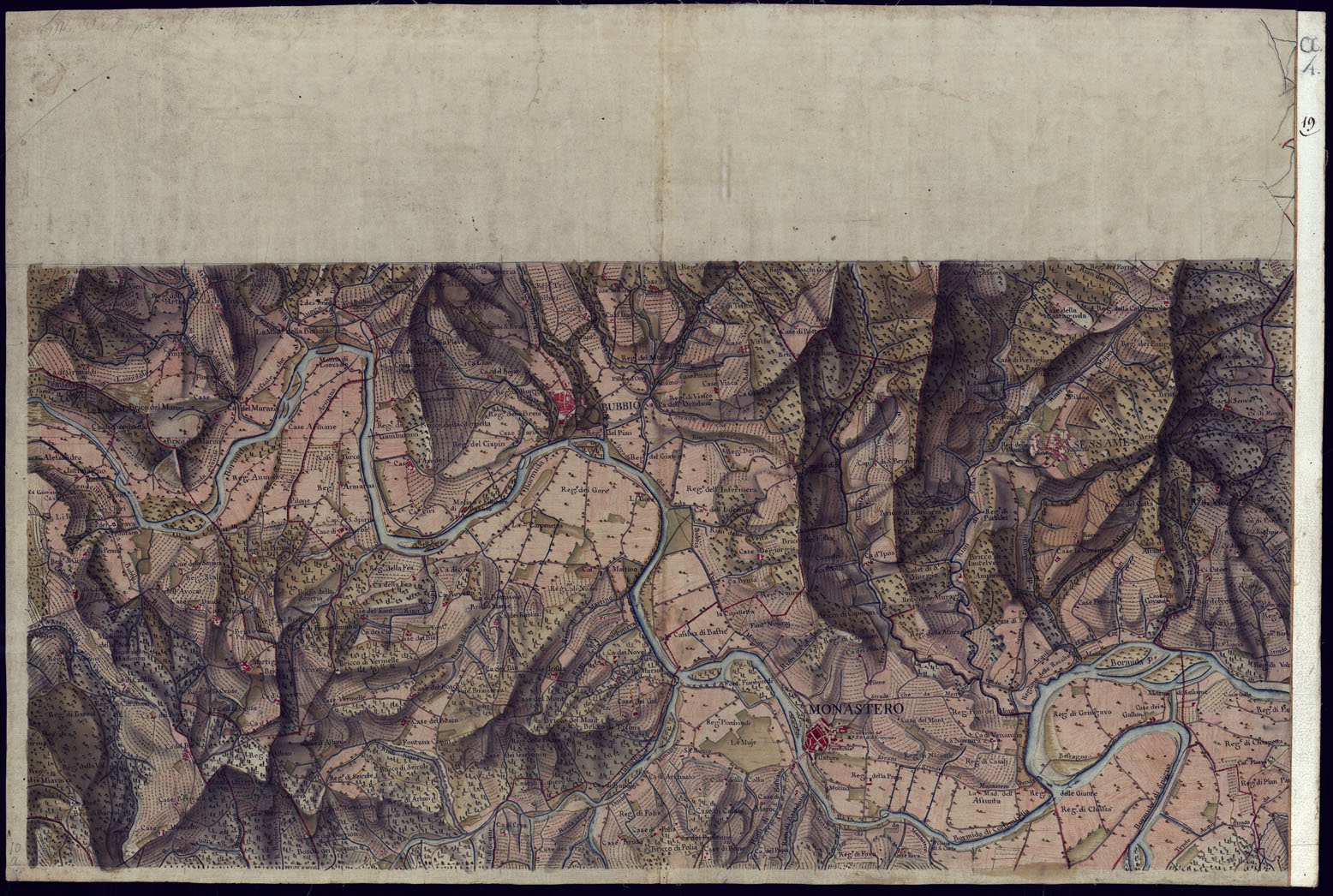 "Cinquantasei fogli più un quadro d'unione, disegnati a penna a più tinte ed acquerellati. Non portano indicazione di data nè di autore, ma si possono ritenere opera della fine del secolo XVIII. Documento topografico del più grande interesse per la copia grandissima degli elementi topografici che vi sono rappresentati, come comporta la notevole grandezza della scala del disegno e per la chiarezza e l'evidenza artistica della rappresentazione. Le città e i villaggi sono rappresentati nella loro pianta geometrica dettagliatissima. Ricchissima pure la toponomastica relativa ai centri abitati, corsi d'acqua, strade, regioni. Sono indicate con diverse tinte le differenti zone di cultura."