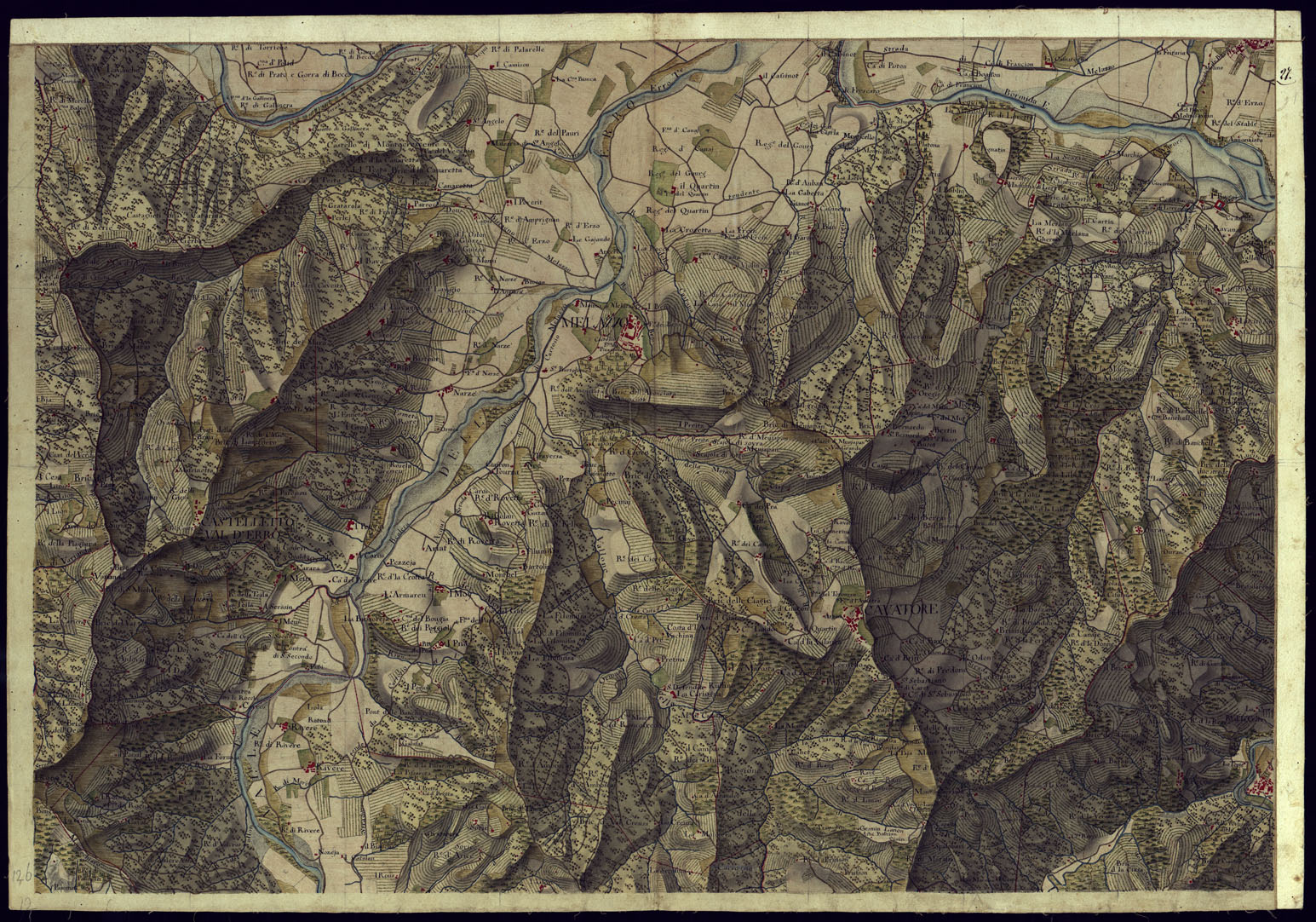 "Cinquantasei fogli più un quadro d'unione, disegnati a penna a più tinte ed acquerellati. Non portano indicazione di data nè di autore, ma si possono ritenere opera della fine del secolo XVIII. Documento topografico del più grande interesse per la copia grandissima degli elementi topografici che vi sono rappresentati, come comporta la notevole grandezza della scala del disegno e per la chiarezza e l'evidenza artistica della rappresentazione. Le città e i villaggi sono rappresentati nella loro pianta geometrica dettagliatissima. Ricchissima pure la toponomastica relativa ai centri abitati, corsi d'acqua, strade, regioni. Sono indicate con diverse tinte le differenti zone di cultura."
