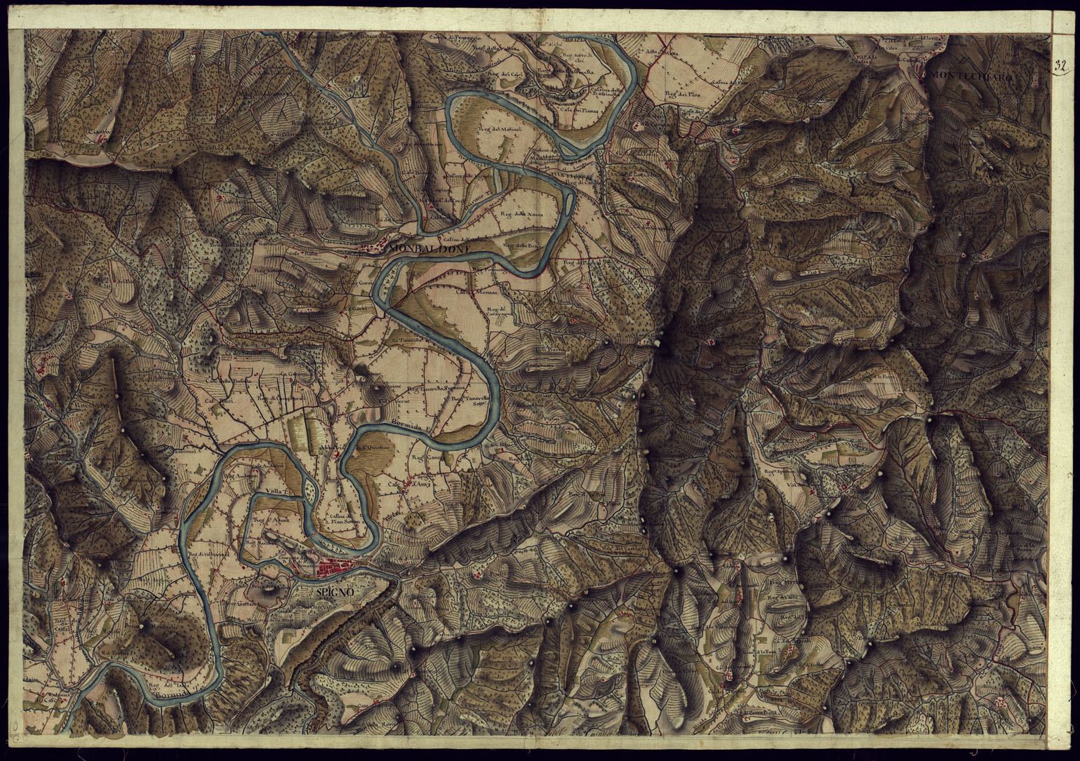 "Cinquantasei fogli più un quadro d'unione, disegnati a penna a più tinte ed acquerellati. Non portano indicazione di data nè di autore, ma si possono ritenere opera della fine del secolo XVIII. Documento topografico del più grande interesse per la copia grandissima degli elementi topografici che vi sono rappresentati, come comporta la notevole grandezza della scala del disegno e per la chiarezza e l'evidenza artistica della rappresentazione. Le città e i villaggi sono rappresentati nella loro pianta geometrica dettagliatissima. Ricchissima pure la toponomastica relativa ai centri abitati, corsi d'acqua, strade, regioni. Sono indicate con diverse tinte le differenti zone di cultura."