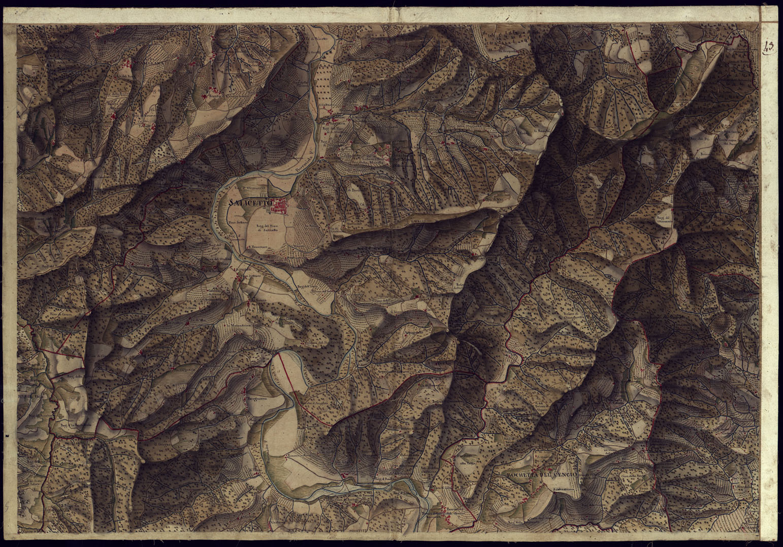 "Cinquantasei fogli più un quadro d'unione, disegnati a penna a più tinte ed acquerellati. Non portano indicazione di data nè di autore, ma si possono ritenere opera della fine del secolo XVIII. Documento topografico del più grande interesse per la copia grandissima degli elementi topografici che vi sono rappresentati, come comporta la notevole grandezza della scala del disegno e per la chiarezza e l'evidenza artistica della rappresentazione. Le città e i villaggi sono rappresentati nella loro pianta geometrica dettagliatissima. Ricchissima pure la toponomastica relativa ai centri abitati, corsi d'acqua, strade, regioni. Sono indicate con diverse tinte le differenti zone di cultura."