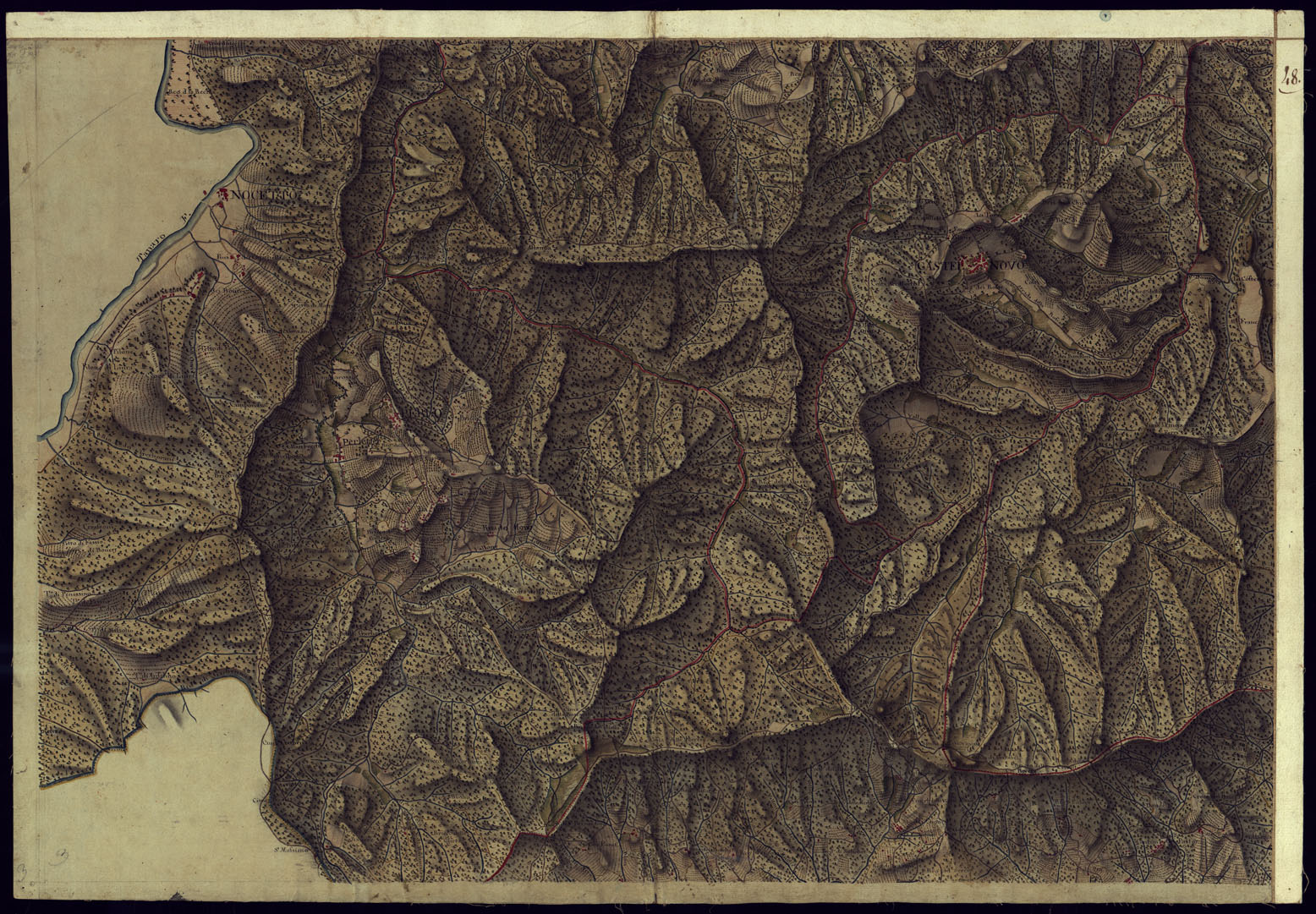 "Cinquantasei fogli più un quadro d'unione, disegnati a penna a più tinte ed acquerellati. Non portano indicazione di data nè di autore, ma si possono ritenere opera della fine del secolo XVIII. Documento topografico del più grande interesse per la copia grandissima degli elementi topografici che vi sono rappresentati, come comporta la notevole grandezza della scala del disegno e per la chiarezza e l'evidenza artistica della rappresentazione. Le città e i villaggi sono rappresentati nella loro pianta geometrica dettagliatissima. Ricchissima pure la toponomastica relativa ai centri abitati, corsi d'acqua, strade, regioni. Sono indicate con diverse tinte le differenti zone di cultura."