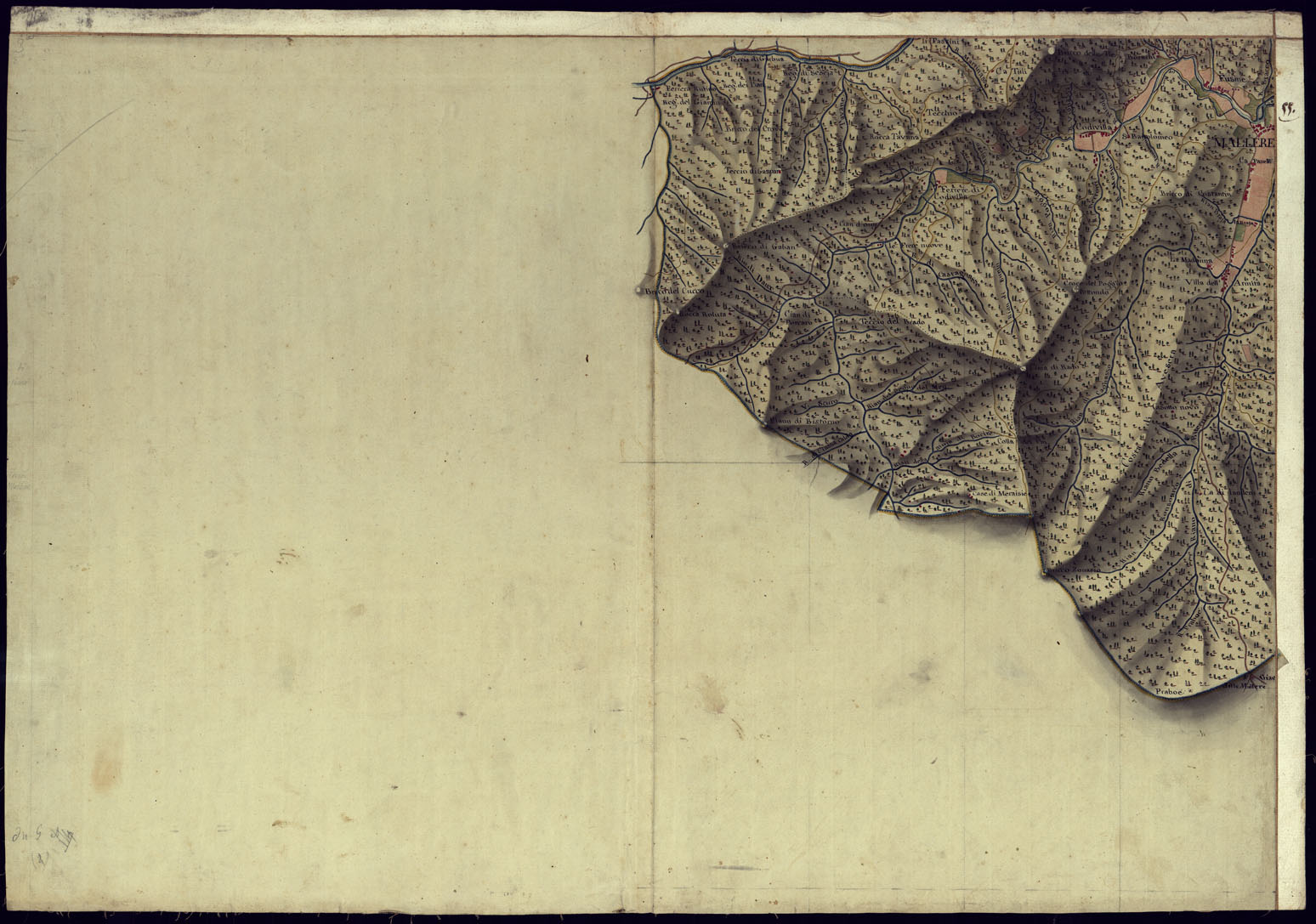 "Cinquantasei fogli più un quadro d'unione, disegnati a penna a più tinte ed acquerellati. Non portano indicazione di data nè di autore, ma si possono ritenere opera della fine del secolo XVIII. Documento topografico del più grande interesse per la copia grandissima degli elementi topografici che vi sono rappresentati, come comporta la notevole grandezza della scala del disegno e per la chiarezza e l'evidenza artistica della rappresentazione. Le città e i villaggi sono rappresentati nella loro pianta geometrica dettagliatissima. Ricchissima pure la toponomastica relativa ai centri abitati, corsi d'acqua, strade, regioni. Sono indicate con diverse tinte le differenti zone di cultura."