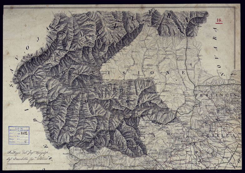"Il titolo non è presente sulla carta. Un foglio disegnato a penna, modello per la rappresentazione della montagna. Secondo le registrazioni di archivio il disegno, eseguito dall'Ing. Brambilla, sarebbe servito da saggio e da modello al disegno generale della carta degli Stati Sardi alla scala di 1:250.000."