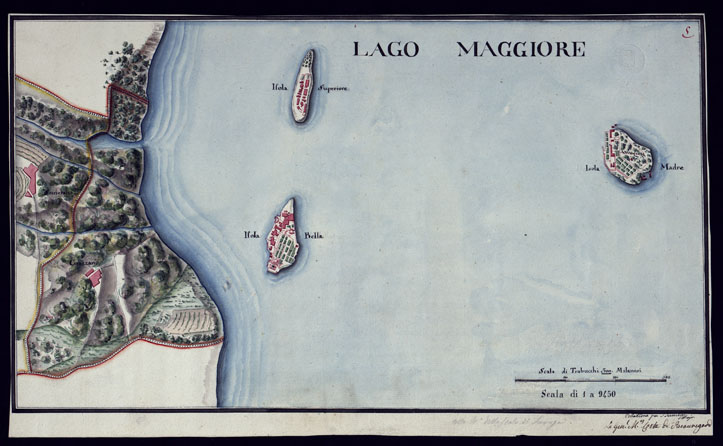 "Il titolo non è presente sulla carta. Disegno a penna a più tinte, acquerellato, in un sol foglio, rappresentante le Isole Borromee e l'adiacente costa occidentale del Lago Maggiore. Scala grafica di 300 trabucchi milanesi = m. 0,095 (pari a 1:9.450). Sono rappresentate con notevole dettaglio le piante dei fabbricati delle isole. Fuori margine, firmato: "Collationè par Birustiel Major" e il visto:" Le Gen. M.s Costa de Beauregard"."