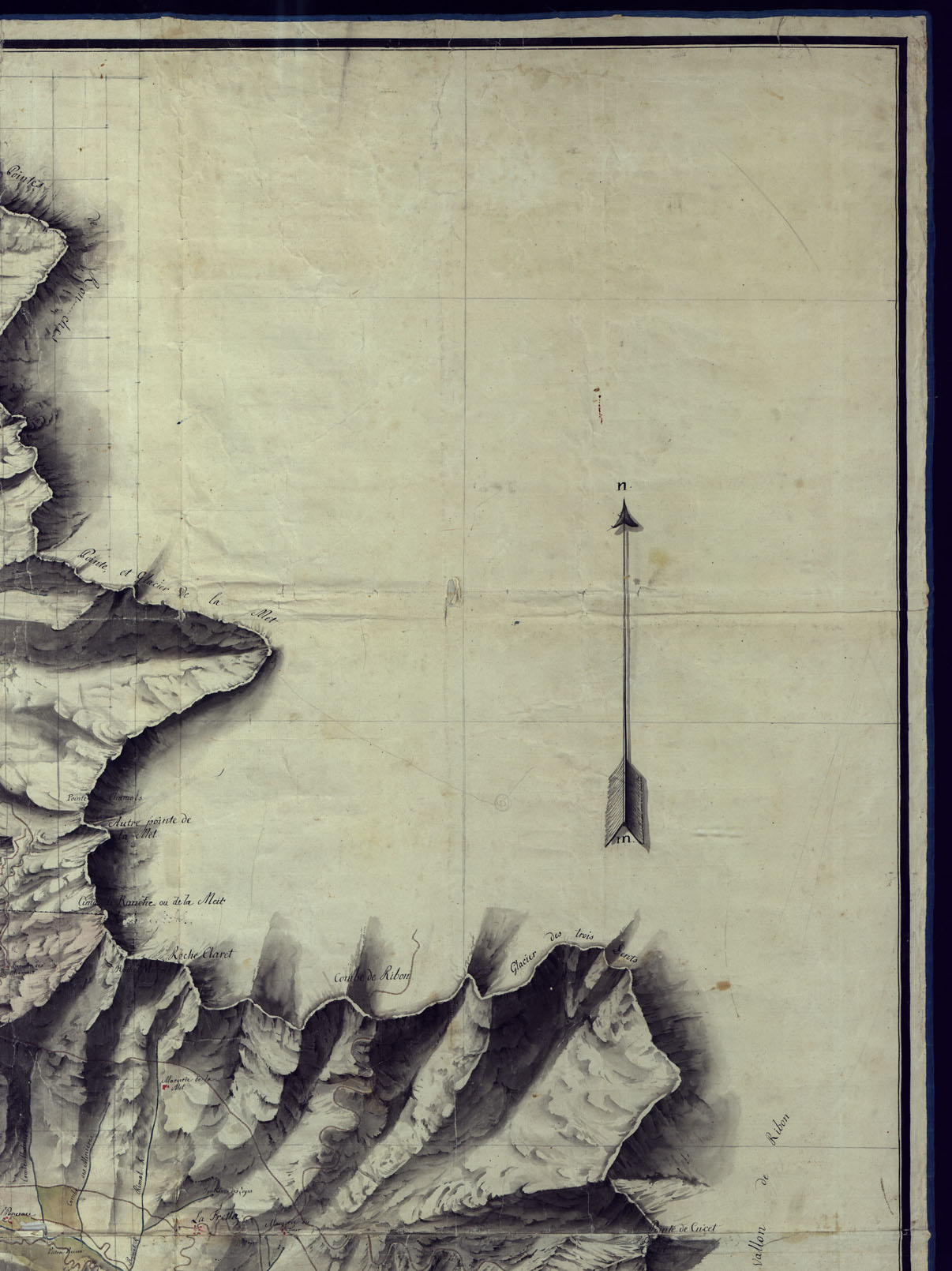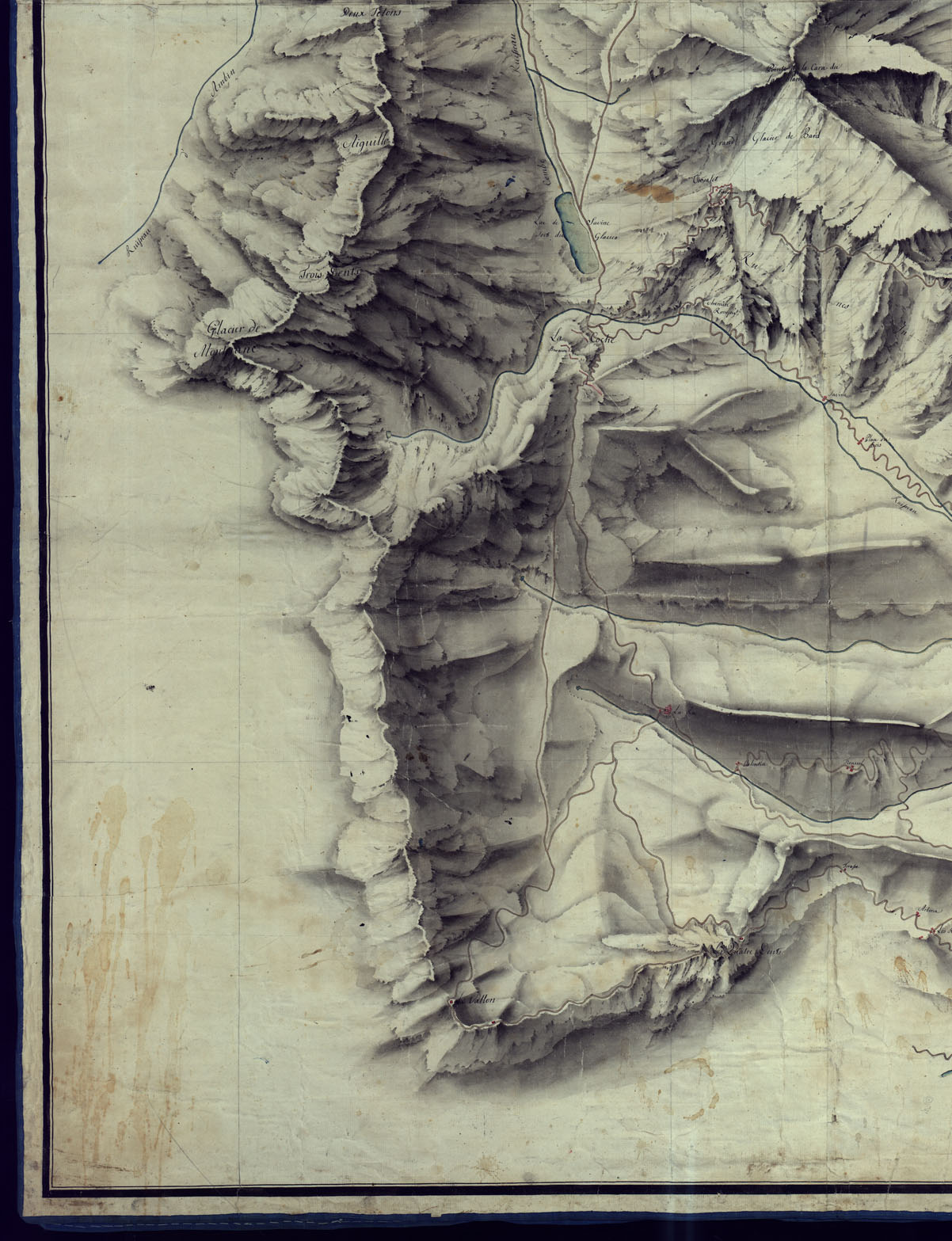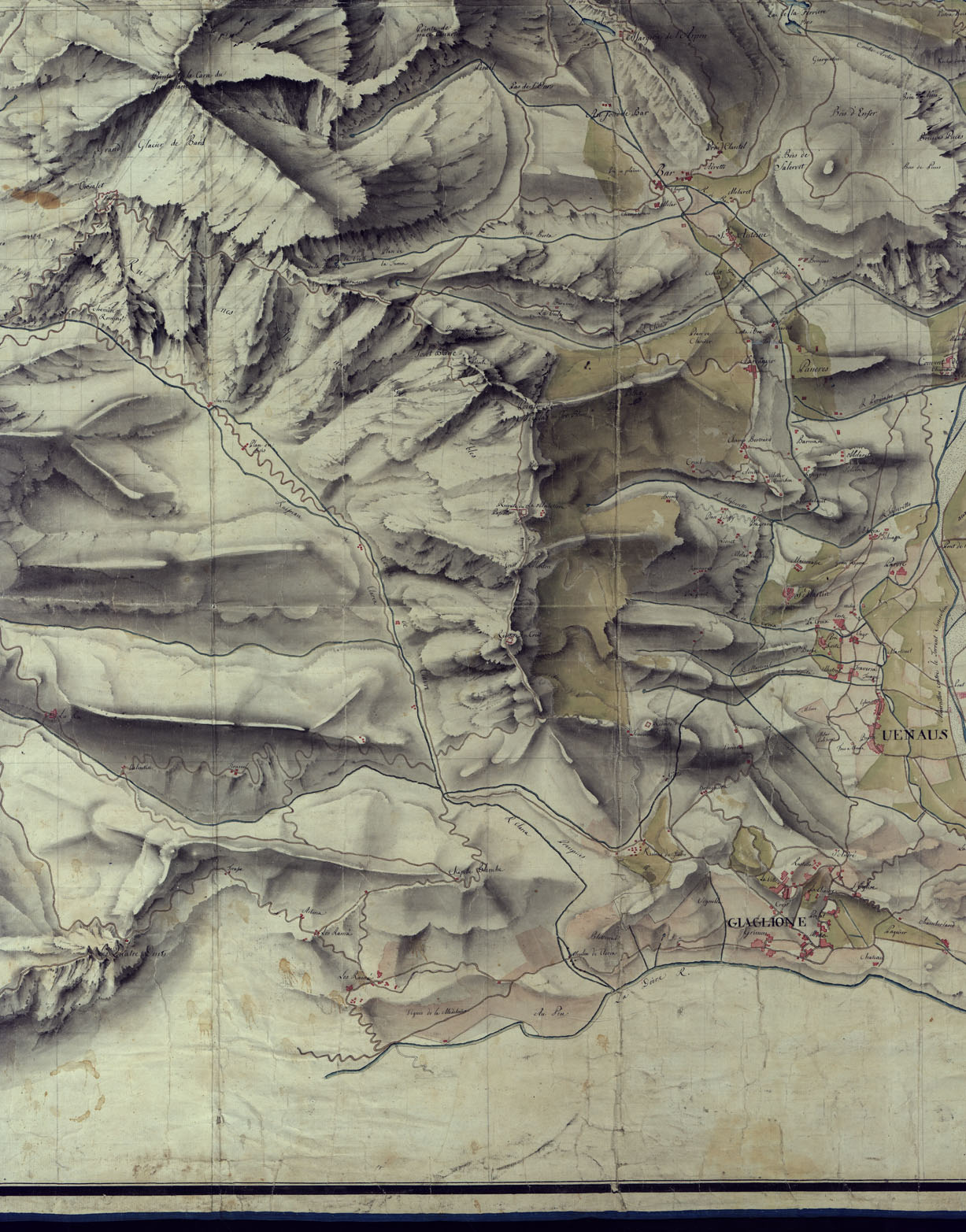 "Un foglio grande montato su tela, scala grafica di trabucchi (600= m. 0,198). Disegno a penna a varie tinte. Non porta indicazioni di data ma sembra dei primi del secolo XIX. Da alcune indicazioni contenute nel disegno, la carta servì per questioni di confini territoriali."