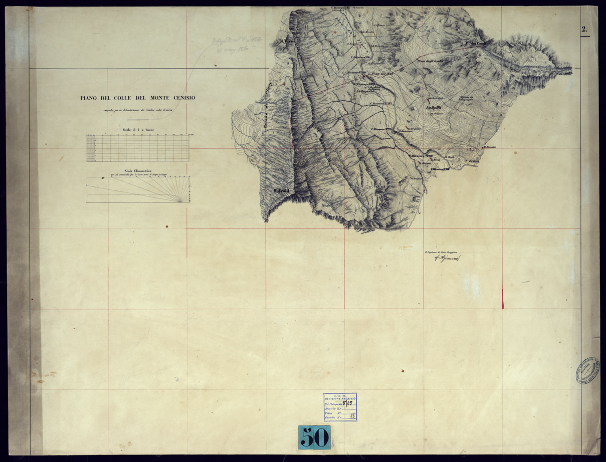 "Eseguito per la delimitazione del confine con la Francia in seguito al trattato 24 Marzo 1860. Due fogli (documenti n. 50-51) parzialmente riempiti e disegnati con grandissima accuratezza. Il terreno vi è rappresentato con curve equidistanti m.5. Il primo reca il tracciato della linea di confine al gran Moncenisio tra il P.te des Conce e il M. Froid passante per il Pian degli Arselin e la casa di ricovero N°XVIII, il secondo quello della linea di confine tra i Lacs des Coulours e la P.te de Bellecombe con una estesa zona adiacente. Portano entrambe le firme del rilevatore Cap. di S.M. Azimonti."