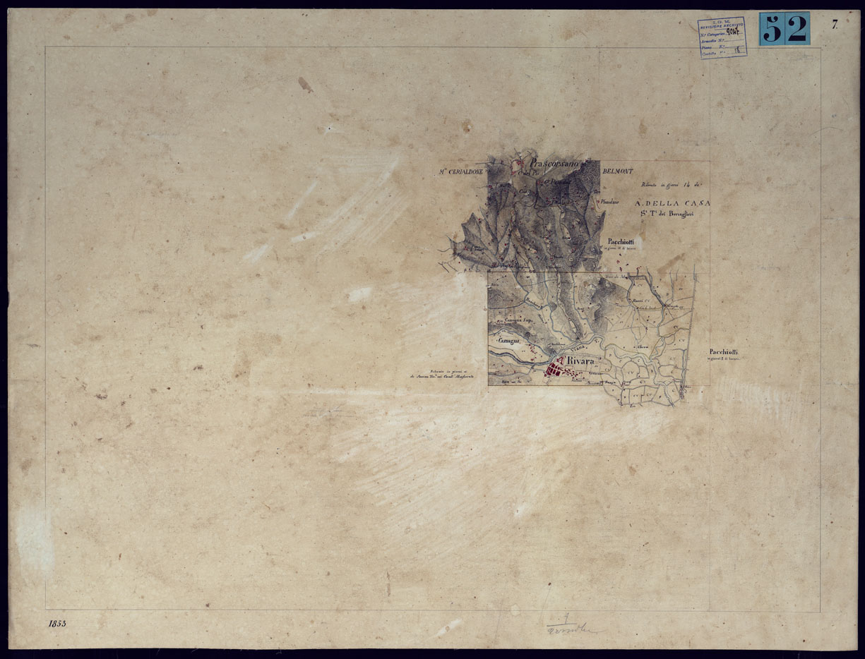 "Nove fogli montati su tela, più un quadro d'unione, originali delle levate eseguite nel 1853 dagli ufficiali ammessi al corso di studi presso il Corpo di S.M. accuratamente disegnati e tratteggiati e recanti il visto del Maggiore A. Righini, Direttore dell'Istruzione. Il documento n°53 è la riunione delle levate su foglio unico montato su tela con dimensioni m.0,50x0,60 entro il campo disegnato. Il documento n°54 è la riproduzione al 50.000 dei disegni precedenti senza scritture, data e firma."