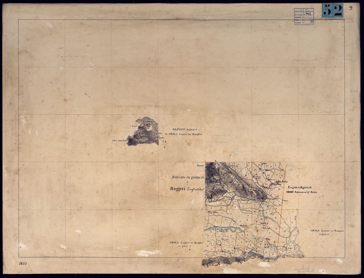 "Nove fogli montati su tela, più un quadro d'unione, originali delle levate eseguite nel 1853 dagli ufficiali ammessi al corso di studi presso il Corpo di S.M. accuratamente disegnati e tratteggiati e recanti il visto del Maggiore A. Righini, Direttore dell'Istruzione. Il documento n°53 è la riunione delle levate su foglio unico montato su tela con dimensioni m.0,50x0,60 entro il campo disegnato. Il documento n°54 è la riproduzione al 50.000 dei disegni precedenti senza scritture, data e firma."