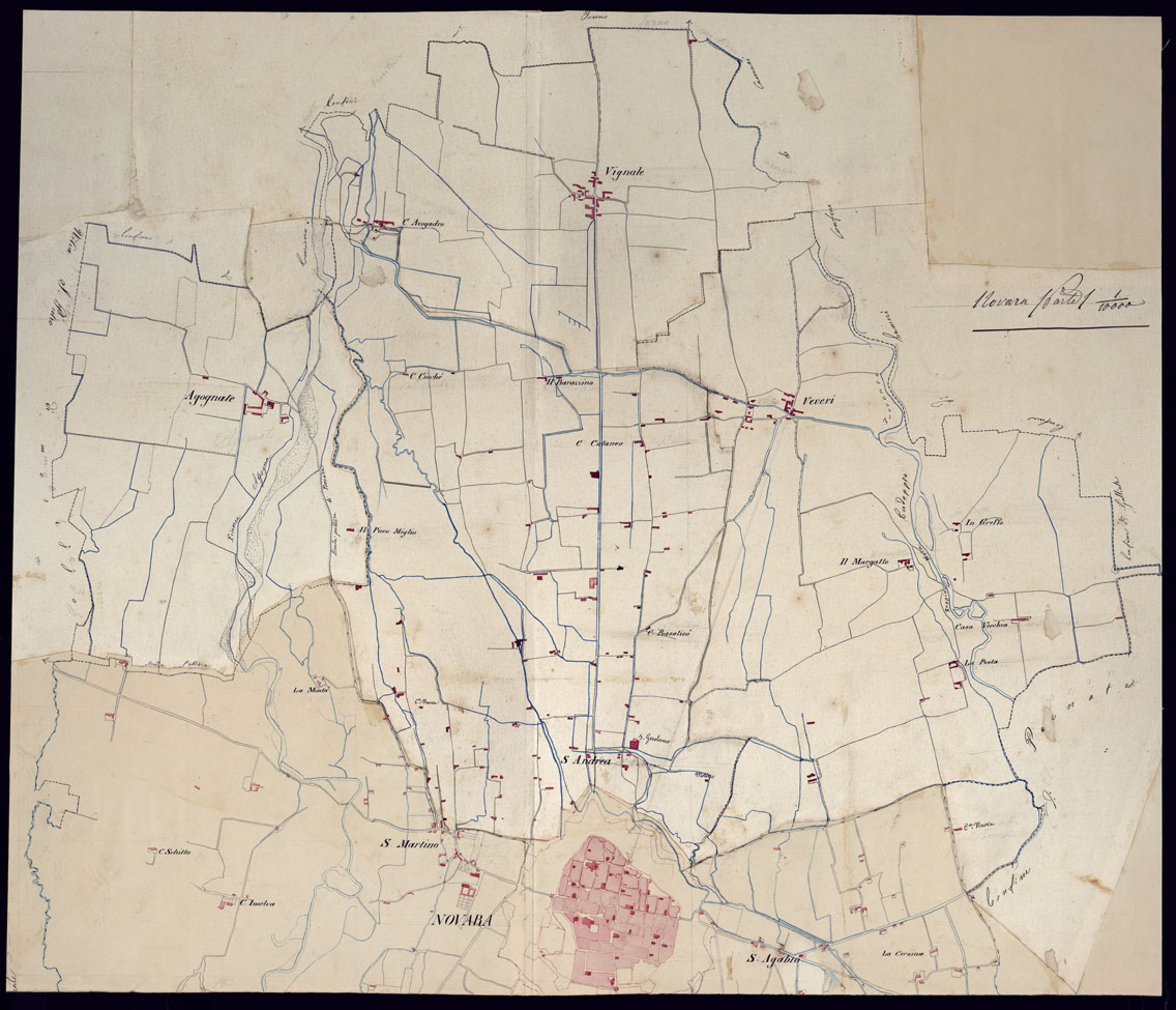 "Due Fogli (nord-sud) costituiti da vari spezzoni uniti a mosaico. La carta non porta nè data nè firma. Probabilmente è copia di rilevamenti di campagna eseguiti nella prima metà del secolo XIX."