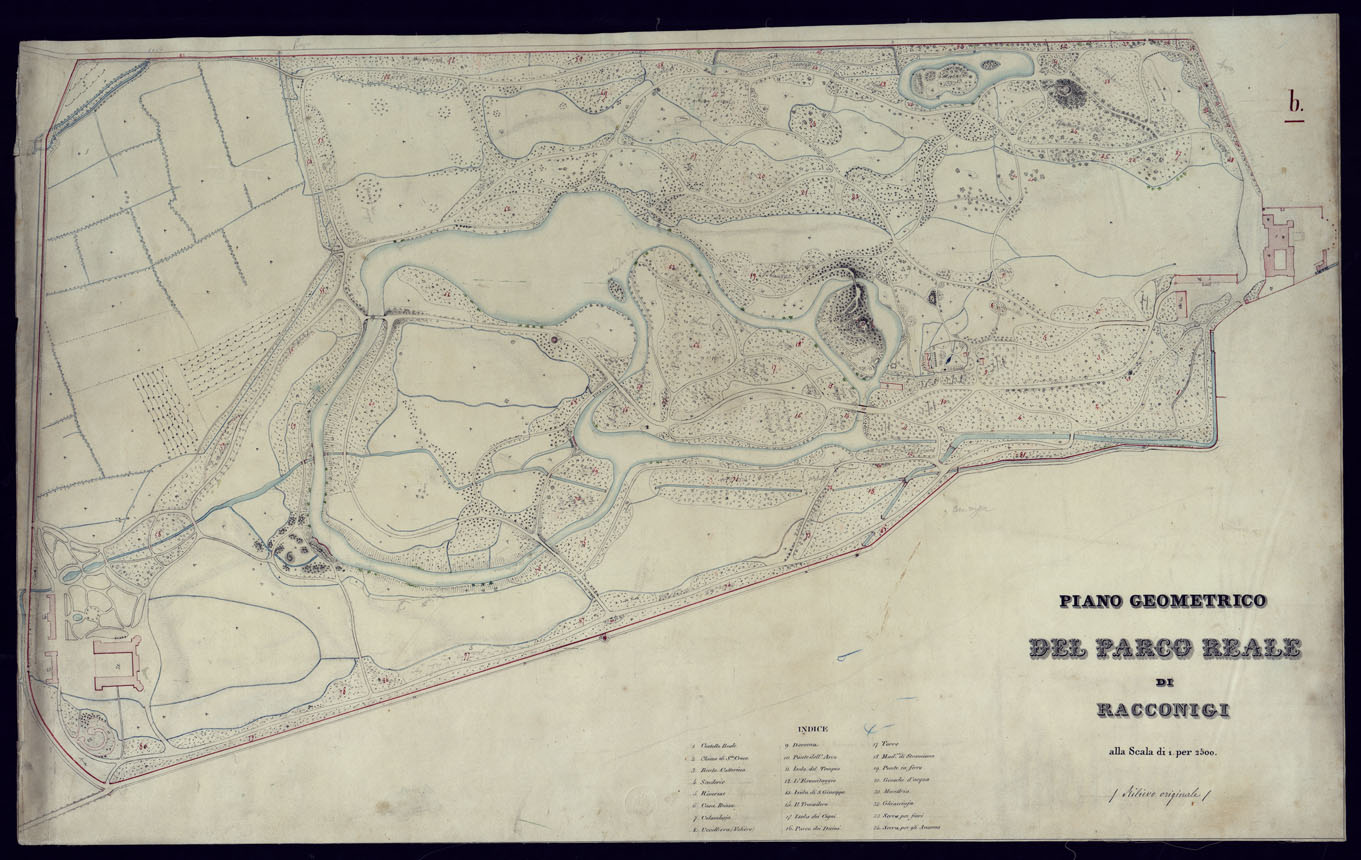 "Un foglio (rilievo originale) accuratamente disegnato a penna riproducente la pianta del Castello e del R. Parco con una tabella di 24 numeri di rinvio ai vari fabbricati, ponticelli e sezioni del Parco. Al pari del piano precedente si deve ritenere eseguito per i lavori di riordinamento del parco eseguito sotto la direzione del Kurten."