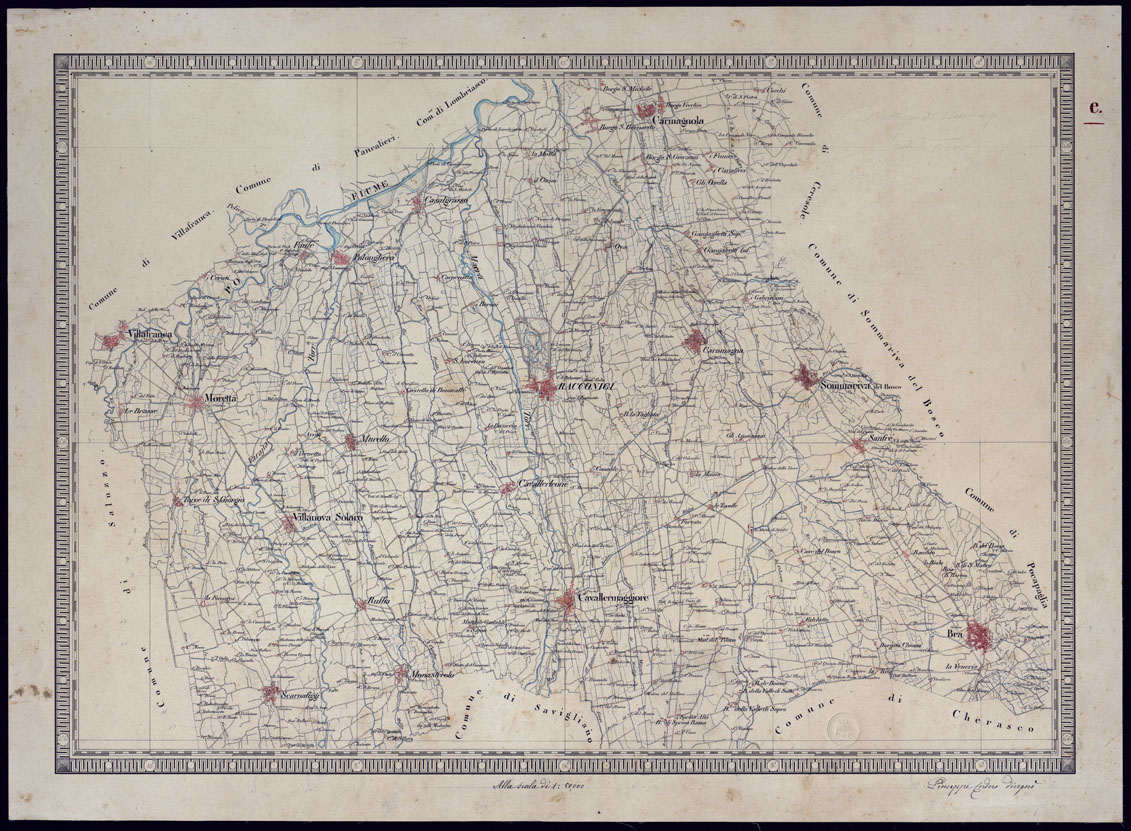 "Un foglio accuratamente disegnato a penna da Giuseppe Cordero, come porta un'indicazione di Archivio. Rappresenta il mandamento di Racconigi ossia il territorio compreso tra Villafranca, Carmagnola, Bra e Cavallermaggiore. Viabilità in nero abitati in rosso acque in bleu."