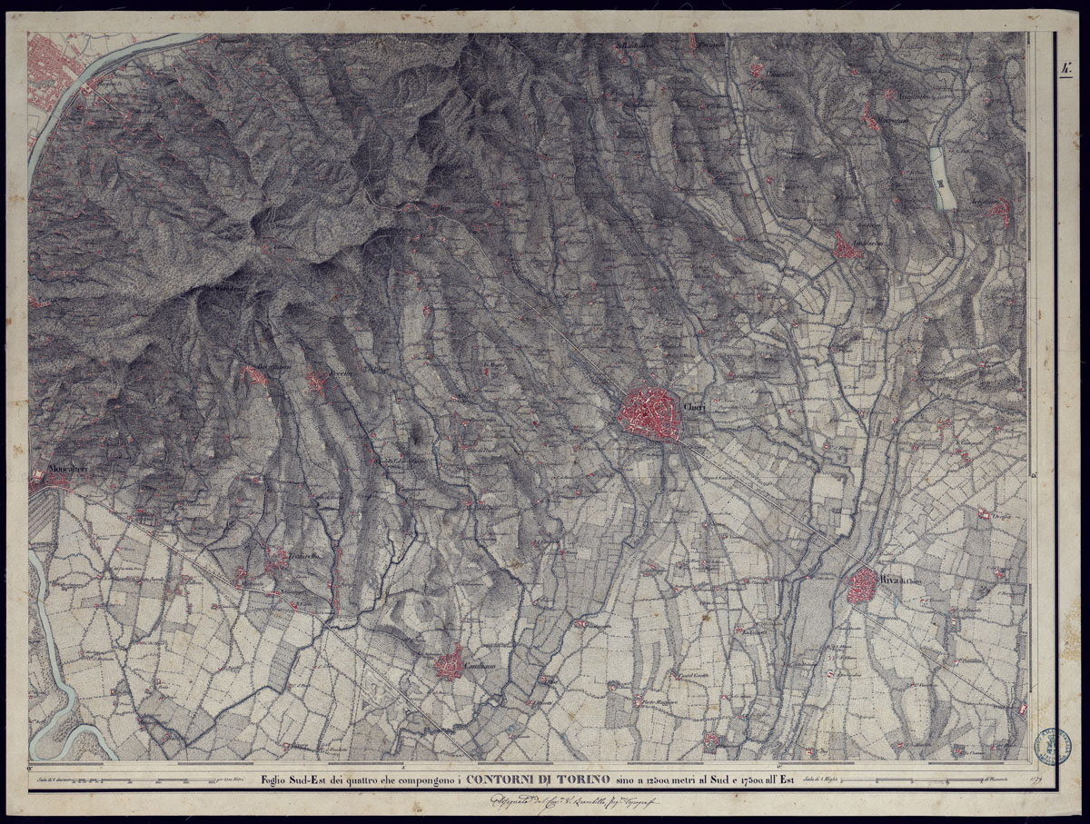 "Il documento si compone di quattro parti finemente disegnate a penna dall'Ingenere Topografo Cav. Vittorio Brambilla rappresentanti i dintorni di Torino sino al 12.500 m. a nord e a sud e 17.500 all'est a all'ovest. Costituiscono gli originali della Carta dei Contorni di Torino che fu poi fatta incidere e pubblicare dal Corpo di S.M. nel 1854 e di cui l'Istituto conserva i rami. Scala 1:25.000. Il documento è composto complessivamente da 11 fogli di cui 4 fogli sciolti, 5 fogli montati su tela a stacchi e 2 spezzoni del foglio 4. Il documento n. 97 è copia dei fogli 3 e 4 della carta stessa."