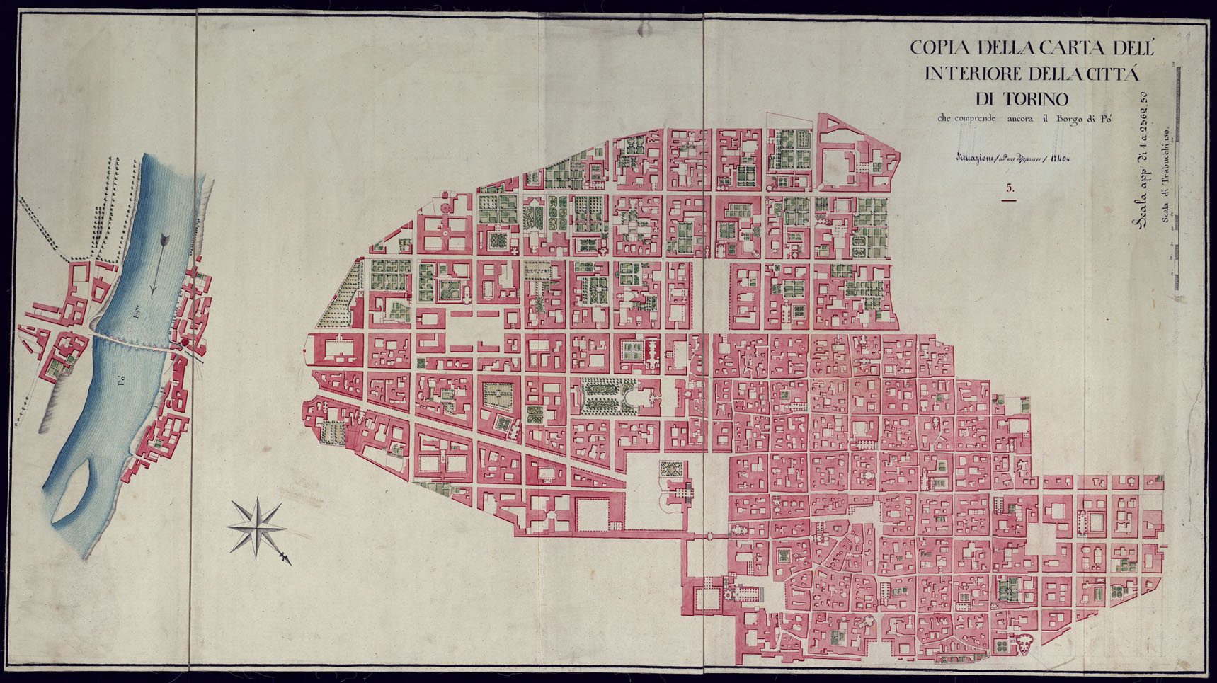 COPIA DELLA CARTA DELL'INTERIORE DELLA CITTA' DI TORINO CHE COMPRENDE ANCORA IL BORGO DEL PO'.