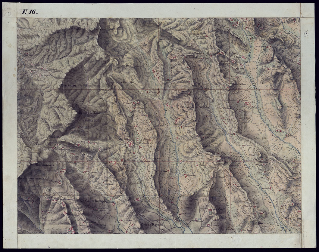 "Il titolo non è presente sulla carta. La carta consta di 24 fogli. I primi quattro fogli provengono da ridisegni mentre gli altri venti sono rilievi originali di campagna e sono in parte costituiti da spezzoni riuniti. Orografia acquerellata a luce obliqua. Qualche foglio reca la firma dei tenenti Salius, Ricci e Morozzo."