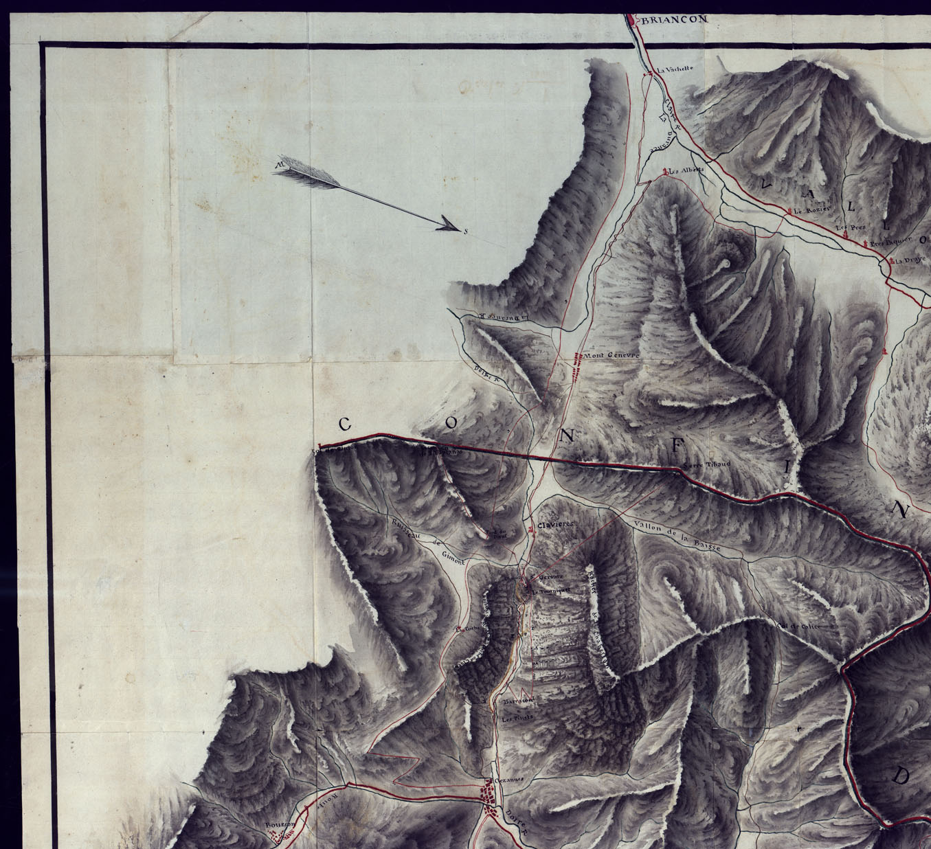 CARTE QUI COMPREND LES ROUTES POUR PASSER EN PIEMONT, DEPUIS BRIANCON PAR LE MONT GENEVRE, ET PAR LE COL DE L'ECHELLE AVEC LA COMMUNICATION DE CELLE DERNIER EN SAVOYE.
