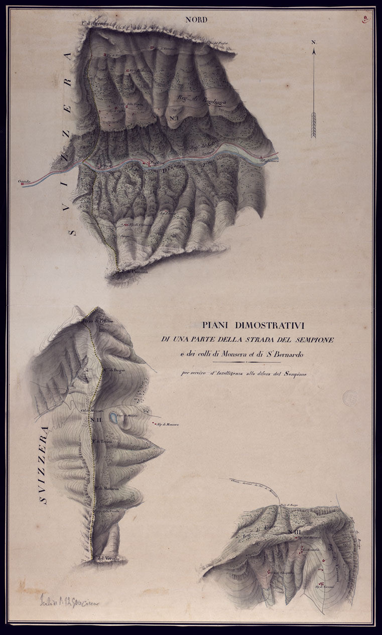 PIANI DIMOSTRATIVI DI UNA PARTE DELLA STRADA DEL SEMPIONE E DEI COLLI DI MONSERA ET DI S. BERNARDO PER SERVIRE D'INTELLIGENZA ALLA DIFESA DEL SEMPIONE.