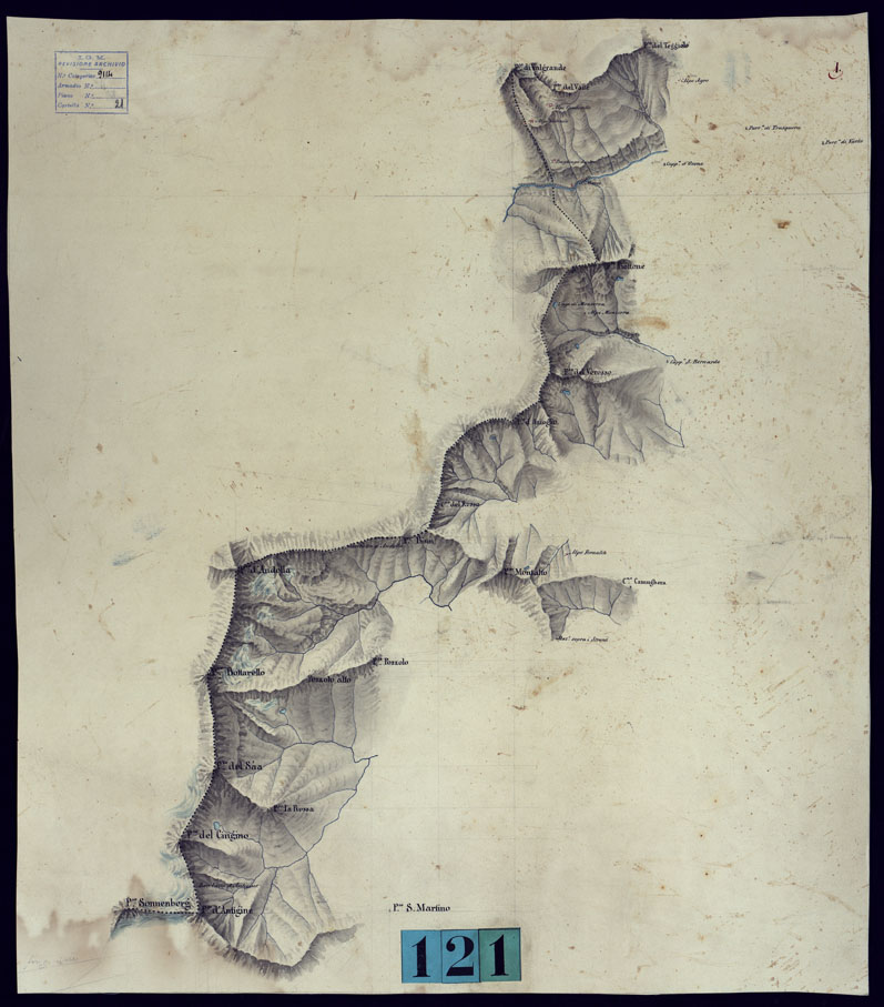 "Il titolo non è presente sulla carta. Tre fogli ad acquerello senza titolo, firma nè data anche se si presume essere stati realizzati nel 1854. Orografia a sfumo a luce obliqua, con alcune quote altimetriche. Abitati in rosso. Idrografia in azzurro. Disegno assai nitido."