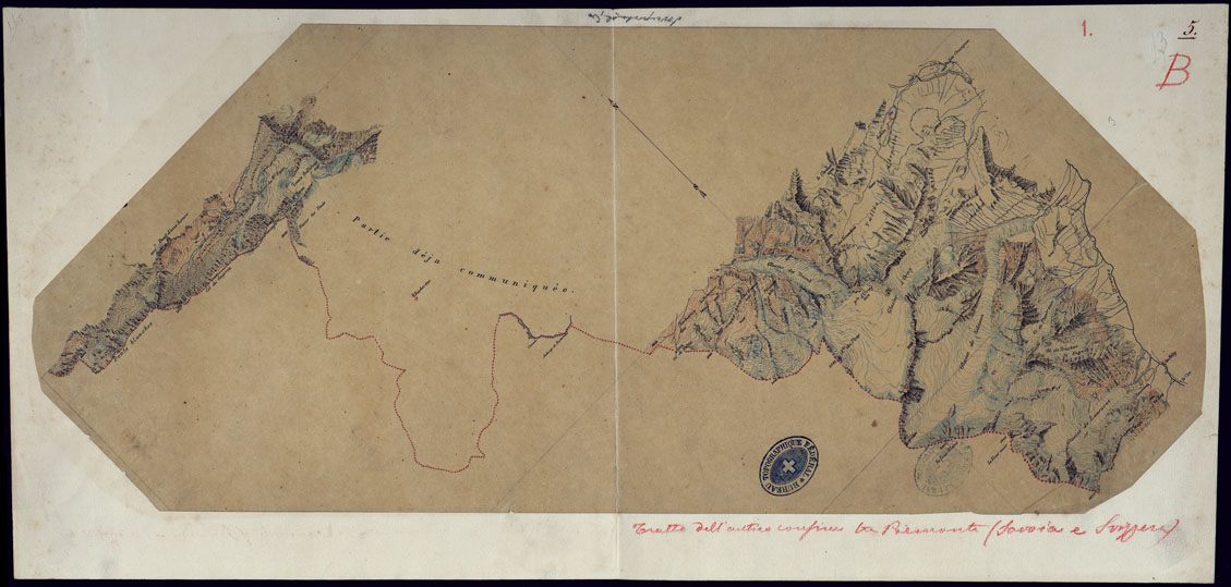 "Il titolo non è presente sulla carta. Otto lucidi montati su tela, provienti dall'Ufficio Topografico Svizzero dietro probabile richiesta dell'Ufficio Tecnico di Stato Maggiore nel 1856 per la costruzione dei fogli della Carta alla scala di 1: 500.000 degli "Stati Sardi di S.M. in terraferema". I lucidi 1 e 2 si riferiscano al tratto di confine tra Svizzera e Savoia dal Col de la Balme al Col Sagerou i lucidi 3e 4 rappresentano il confine tra Italia e Svizzera dal M. Rosa al M. Dolent i lucidi 5 e 6 comprendano un tratto di confine nel Canton Ticino il lucido 7 si riferisce al tratto di confine presso Domodossola il lucido 8 contiene una parte della valle de la Dranse dalla confluenza col Rodano a Champsce. Orografia a curve di lievllo e tratteggio (rocce), abitati in rosso, idrografia in azzurro, strade, nomi, quote altimetriche, ecc., in nero."