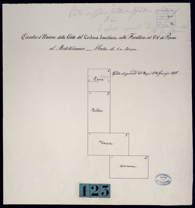 CARTA DEL CORDONE SANITARIO SULLA FRONTIERA AD EST DI PAVIA AL NEDITERRANEO SCALA DI 1 A 50 000 - QUADRO D'UNIONE.